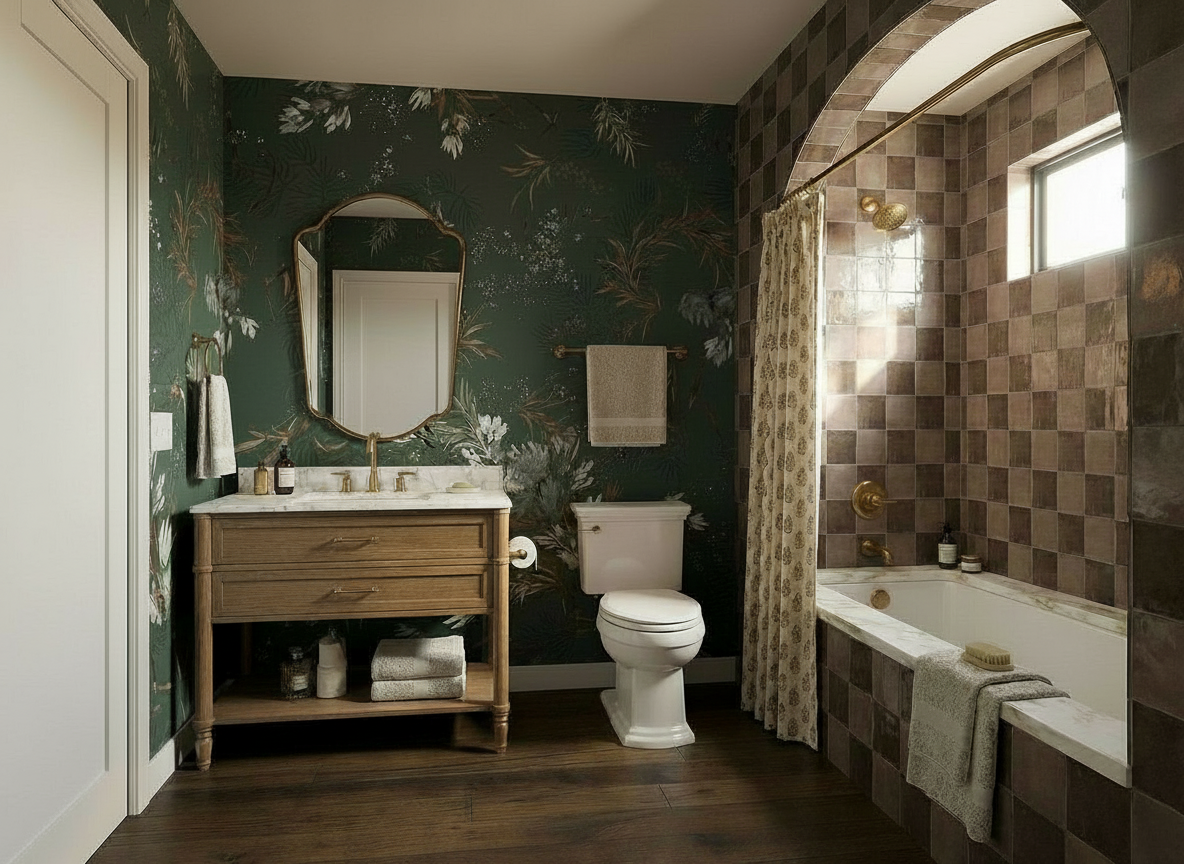change the shower curtain in my upload image so it s mounted on the inside of the shower arch like the one in my reference image change only the shower curtain