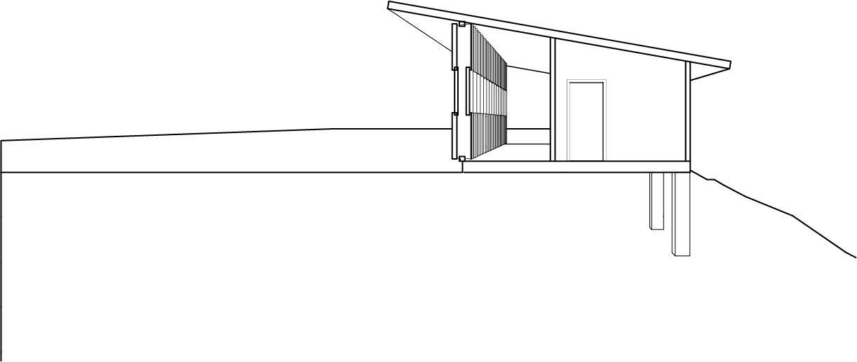 render this architectural section drawing as a realistic atmospheric sectional perspective of a modern woodland cabin on stilts the structure features warm natural wood framing vertical wood screen elements and a dark charcoal standing seam metal roof the ground slopes gently with soft earthy soil and tall grasses the surrounding environment is misty and calm with sage green vegetation and soft fog drifting through the background lighting is soft sunrise light entering from the left creating warm highlights on the wood and gentle shadows inside the interior space color palette is muted and earthy mist green warm sand beige soft clay terracotta natural wood brown and charcoal gray the mood is quiet cinematic contemplative and minimal ultra detailed materials realistic global illumination architectural visualization quality