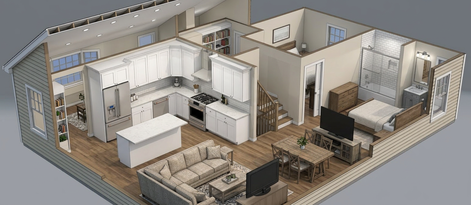 convert this floor plan into a architectural isometric 3d view of a full house show the space from an elevated angle with furniture walls and details visible use the same furniture as shows on the plan do not change the orientation of the floorplan