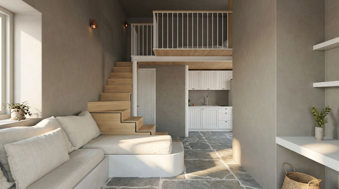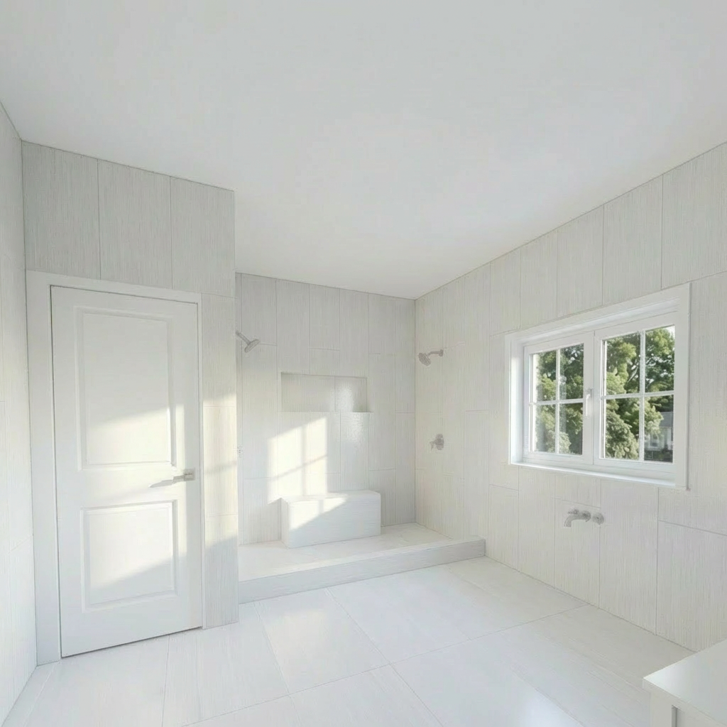 keep everything exactly the same in the rendering do not change the layout walls doors windows shower niche plumbing fixtures wall tile lighting vanity or any materials only change the door and make it a flush mount no panel modern door do not change the tile material color layout keep everything else exactly the same make the final image look like a realistic photo rendering with natural lighting and soft shadows