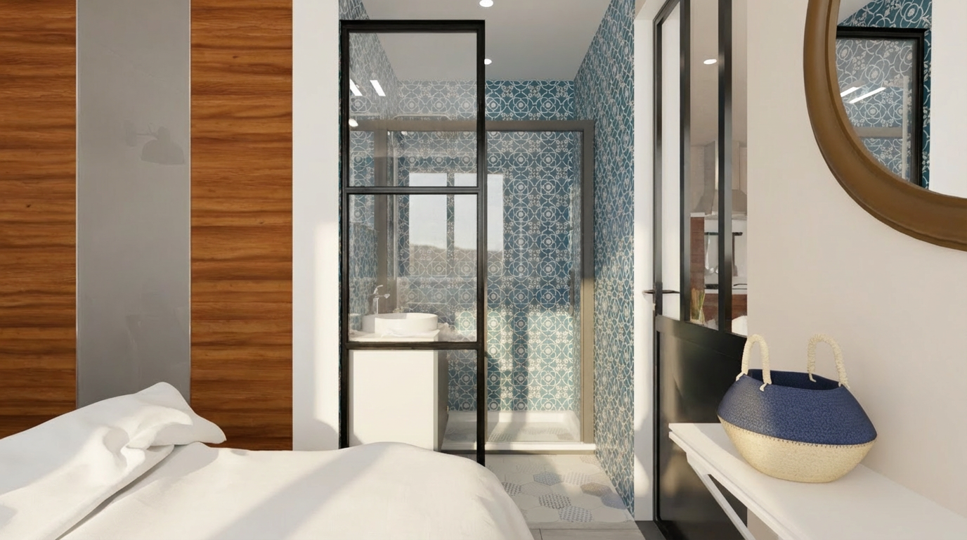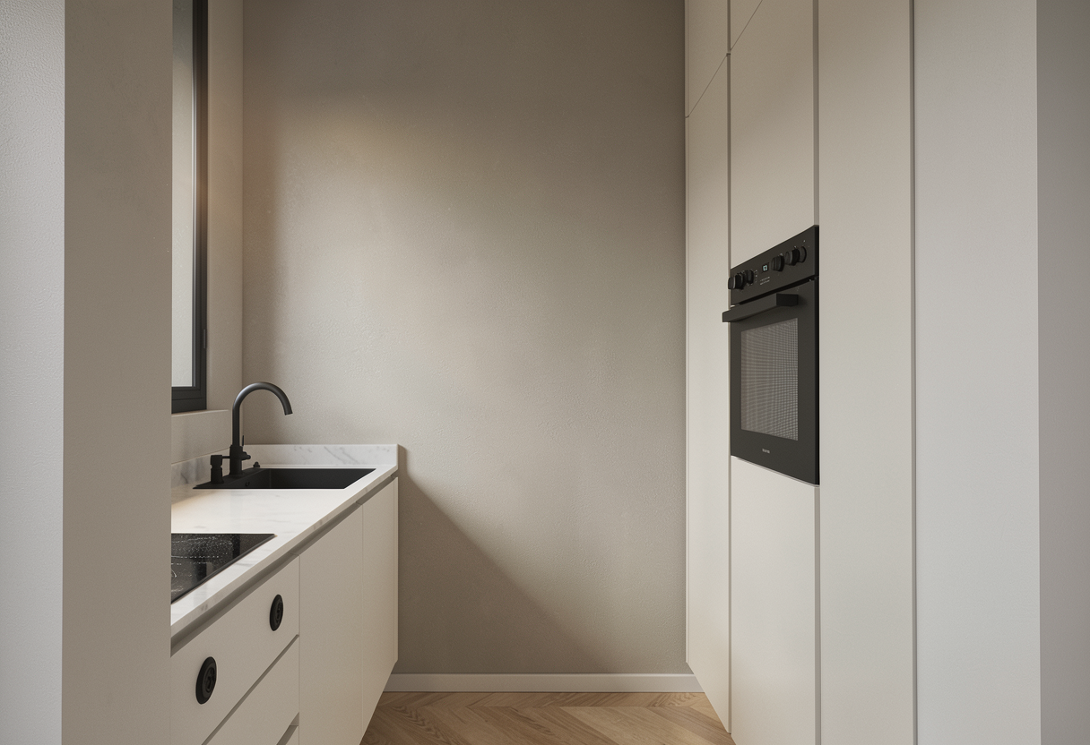 keep model colors view from small living room into open kitchen and bedroom area both bedroom and kitchen has windows greenery and small city view outside the bedroom windows natural light coming into kitchen add cozy touches like coffee table decor throws striped pillows keep colors and details the small living room has two mirrors on the right hand side do not add extra furniture