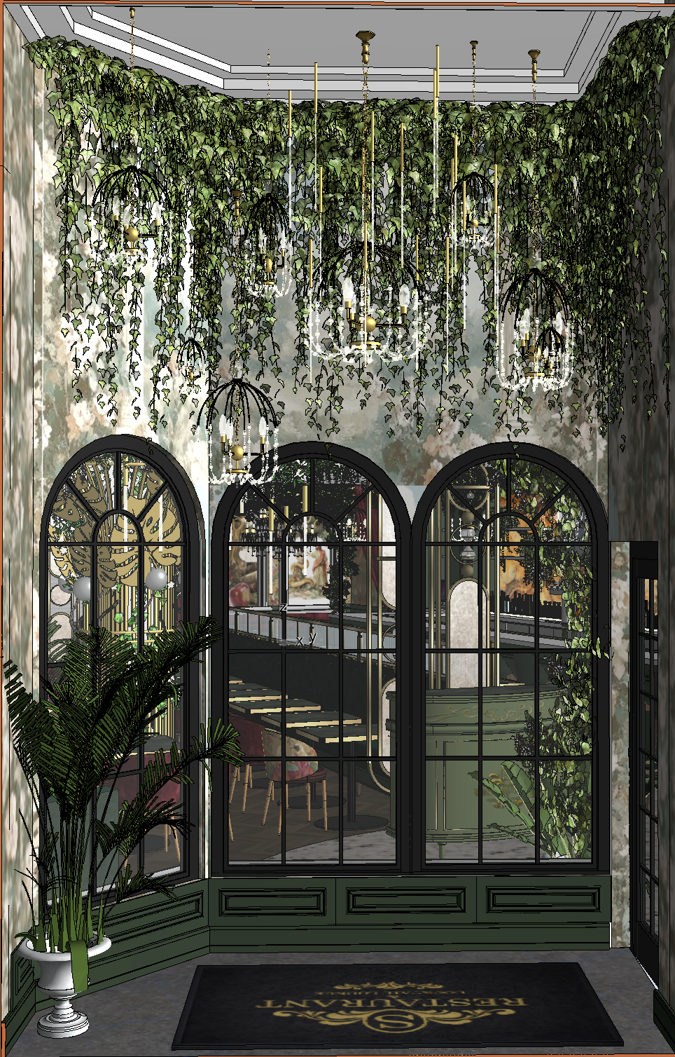 ultra photorealistic architectural render of the seven restaurant entrance interior strictly following the existing geometry proportions window shapes ceiling profile wall placement and camera angle do not modify layout or design elements enhance realism only triple arched black metal framed windows with realistic powder coated texture subtle imperfections micro scratches and accurate glass reflections glass must show natural reflections from exterior light slight interior transparency realistic refraction and depth no flat rendering true physical glass behavior ceiling fully wrapped in cascading natural greenery with realistic leaf variation depth layering and gravity driven movement integrated white hydrangea clusters only soft petal translucency delicate shadows botanical realism no colored flowers hanging chandeliers with crystal prisms and brushed brass components must show real crystal refraction warm candle like bulbs and subtle sparkle brass rods suspended vertically from the ceiling should display brushed texture soft metallic reflections and natural patina variation wall finish behind greenery should have realistic plaster texture with tonal variation slight aging soft irregularities not flat light interaction between greenery and wall surface must create layered shadows through the windows visible interior elements host stand brass structure seating should appear slightly diffused by the glass with accurate depth of field and natural interior lighting glow foreground black entrance mat with gold seven restaurant logo in embossed metallic finish realistic fabric fibers soft wear subtle sheen on the gold print potted palm in classic white planter with realistic ceramic gloss natural leaf translucency and shadowing lighting balanced daylight mixed with warm interior glow soft natural shadows realistic ambient occlusion in corners no oversaturation true to life color grading elegant refined slightly muted tones materials must feel tactile brushed brass crystal velvet glimpsed inside painted millwork plaster glass foliage add subtle imperfections everywhere fingerprints on glass tiny dust particles in light beams minor unevenness in metal final image must look like a high end architectural photograph shot with a professional full frame camera natural exposure sharp detail subtle depth of field physically accurate lighting maximum realism