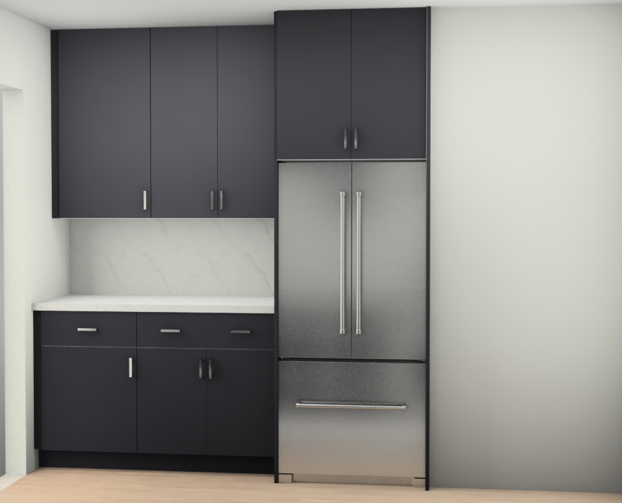 black slab cabinets with a bronze brass hardware light veining in countertop no sink