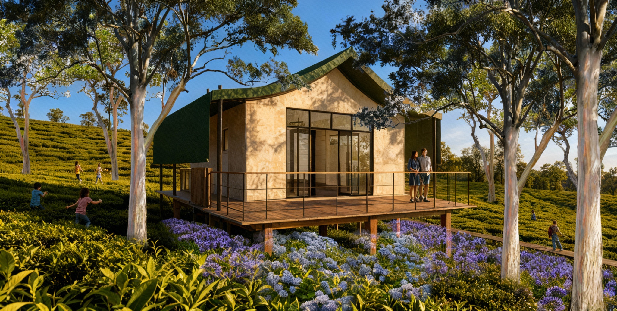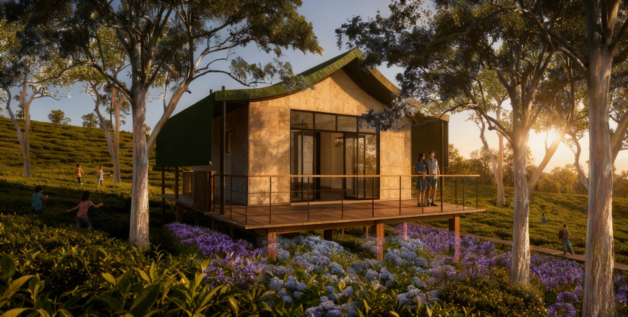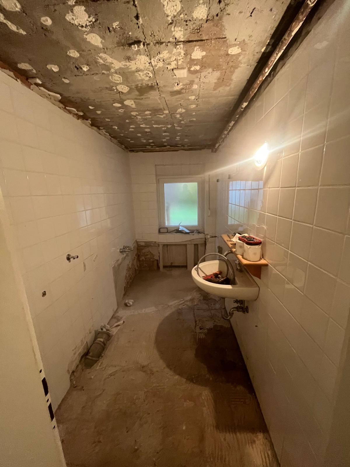 create a new bathroom with a shower on the left side by the window a toilet and a sink style modern colours beige and brown oak