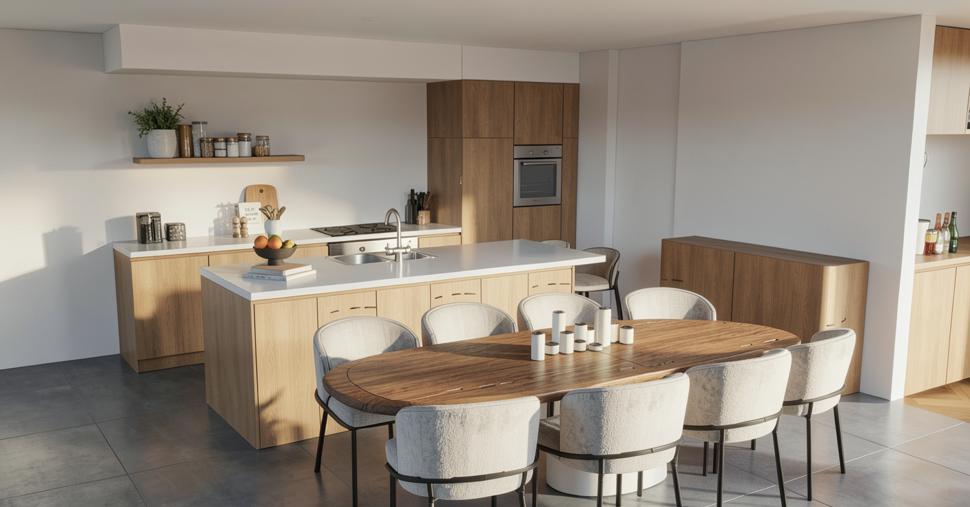 guest bedroom nice clear beige bouclette tones bed with brown cushions and with wood panels on the wall behind the bed transparency with led in the closet one hanging part one drawers part ceiling with a contemporary molding and led indirect with curve in the 4 90 degrees angles