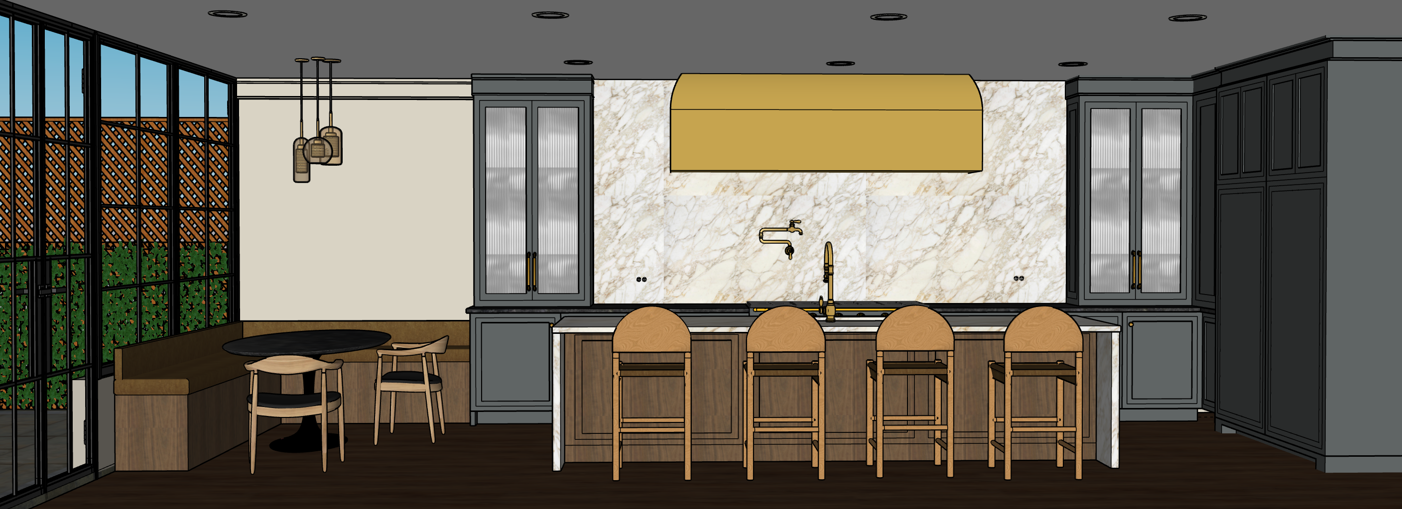 charcoal color painted surround cabinetry walnut island black leathered granite on surround countertop calacatta marble on island and backsplash unlacquered brass cabinet hardware antique brass range hood cream white painted walls dark stain oak floors camel color suede bench cushion on banquette at table