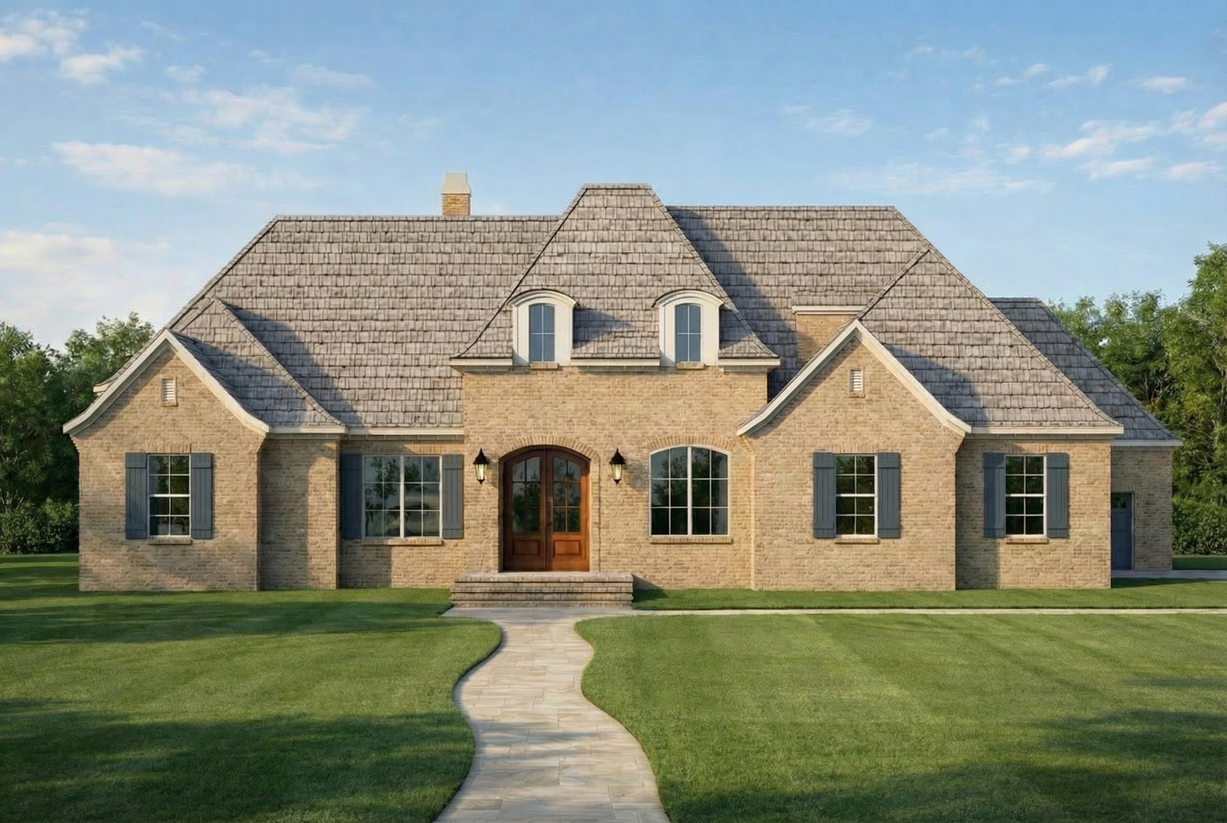 light gray shingles light beige brick shutter color is sherwin williams sw9056 add hanging light over door add copper chimney cap add long rectangle exterior lighting