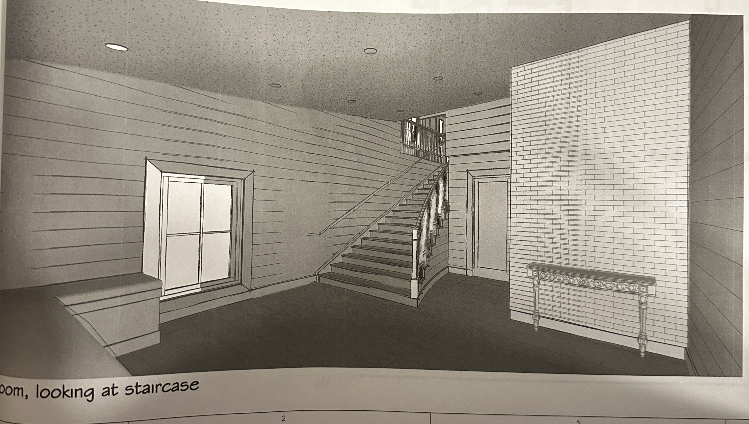 make a photo realistic image of this room the floor is light wood the brick wall should be white make the stair railing white and the treads light wood to match the floor the shiplap wall is white drape a light peach widow covering over the window hang a french style crystal chandelier from the middle of the ceiling