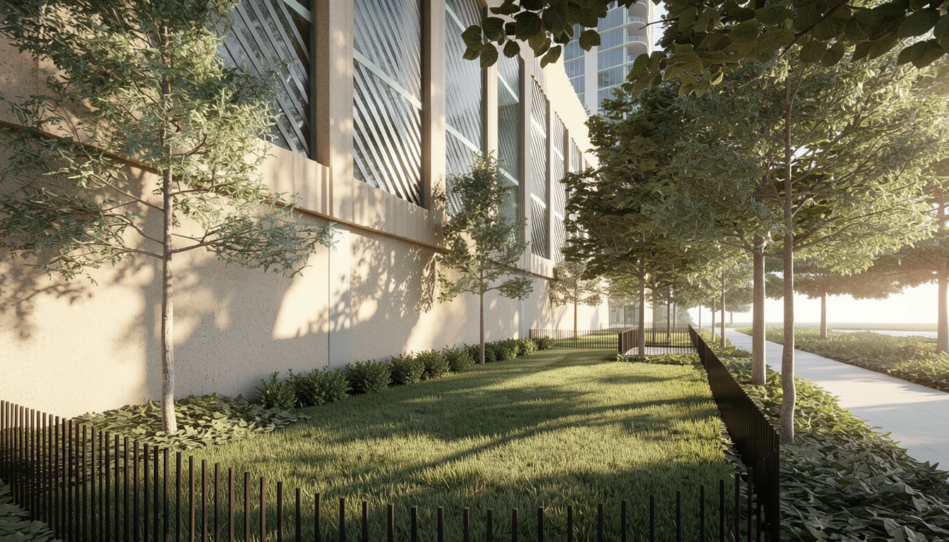 high end marketing image dramatic day time lighting simple planting add small turf hills