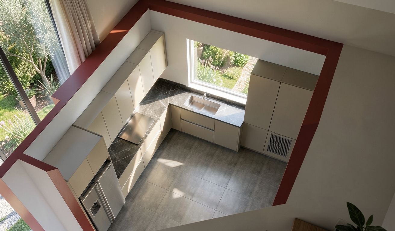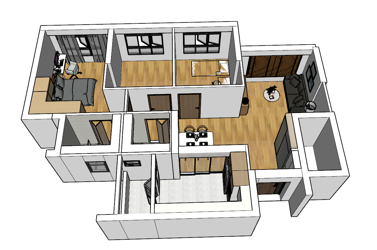 convert this floor plan into a realistic isometric 3d view of a full house show the space from an elevated angle with furniture walls and details visible use the same furniture as shows on the plan do not change the orientation of the floorplan