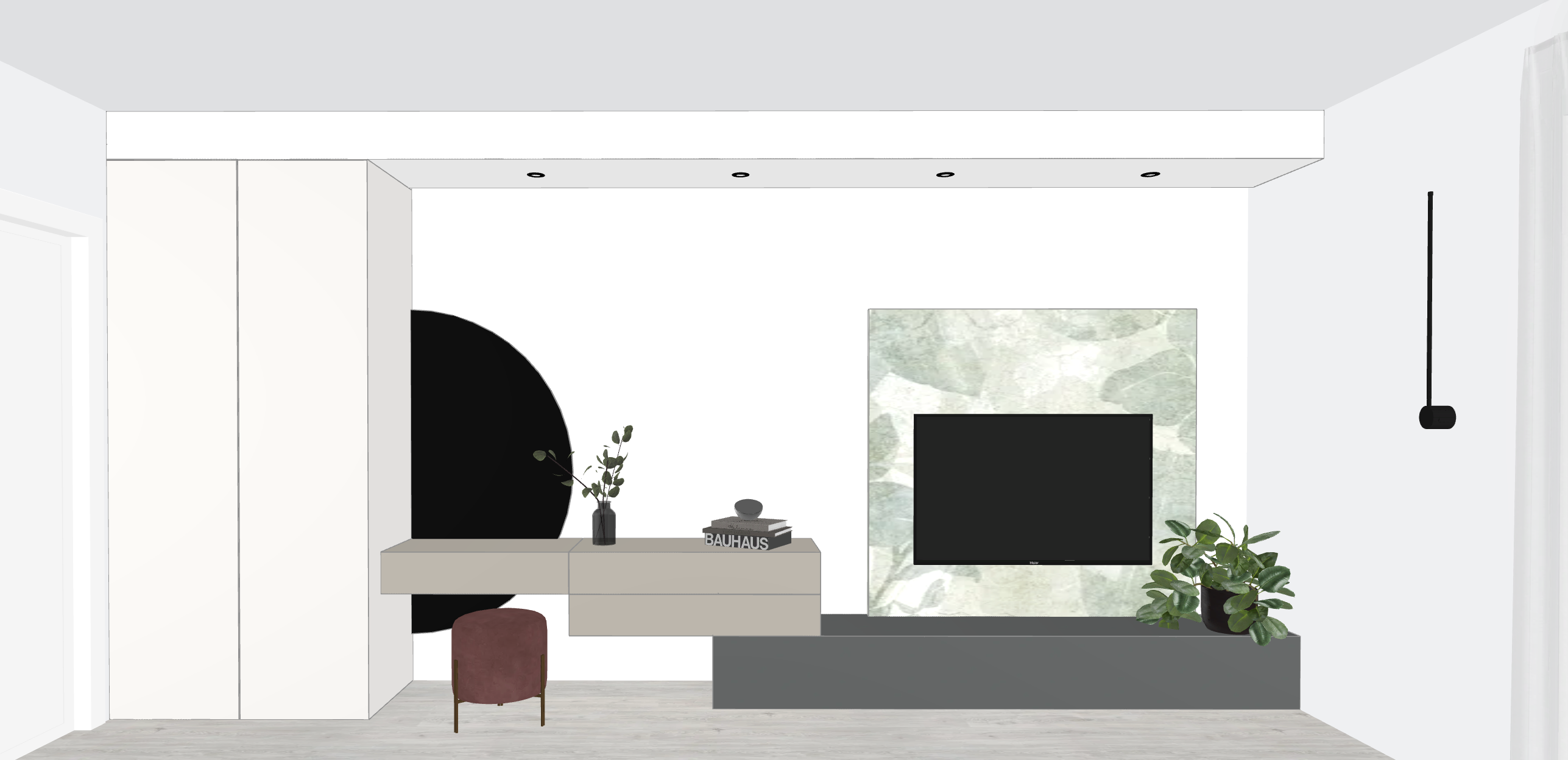 front view eye level camera height 150 cm 35mm lens balanced perspective ultra realistic materials soft natural daylight entering from the left side the space features a custom gypsum board false ceiling veletta with integrated recessed spotlights matte black trim warm light 3000k hidden linear led strip on the inner back edge creating a soft wall wash effect light diffusion realistic soft shadows no overexposure a suspended composition including a tall matte warm white cabinet on the left a floating taupe beige desk console with drawers a low dark grey matte tv base unit behind the tv large decorative panel clad in green botanical wallpaper inkiostro bianco wild eden style soft sage and desaturated green tones slightly textured surface the panel is backlit on three open sides with a concealed warm led 3000k creating a soft halo glow around the perimeter on the left a half height vertical mirror with soft rounded top edge the mirror is backlit producing a subtle floating glow effect materials light oak wood flooring matte finish walls warm neutral white furniture matte lacquer finishes tv screen off subtle reflection only decorative elements minimal styling plant near tv unit small vase and books on desk lighting setup combination of natural daylight integrated architectural lighting warm ambient light 3000k realistic indirect light bounce no harsh contrast soft cinematic shadows high dynamic range global illumination enabled mood elegant contemporary calm architectural lighting focus luxury residential interior ultra photorealistic high detail textures realistic reflections soft depth of field render quality 8k resolution physically accurate lighting ray tracing global illumination high material realism