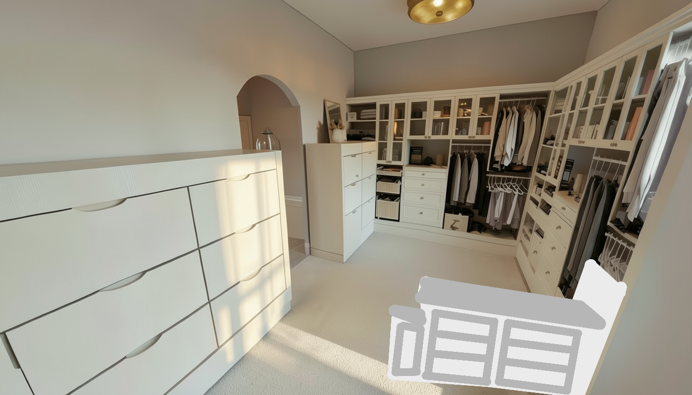 create a closet with a packing peninsula with a marble top at the left end of the bench there should be a small seat lower to the ground the side of the peninsula should have doors and drawers