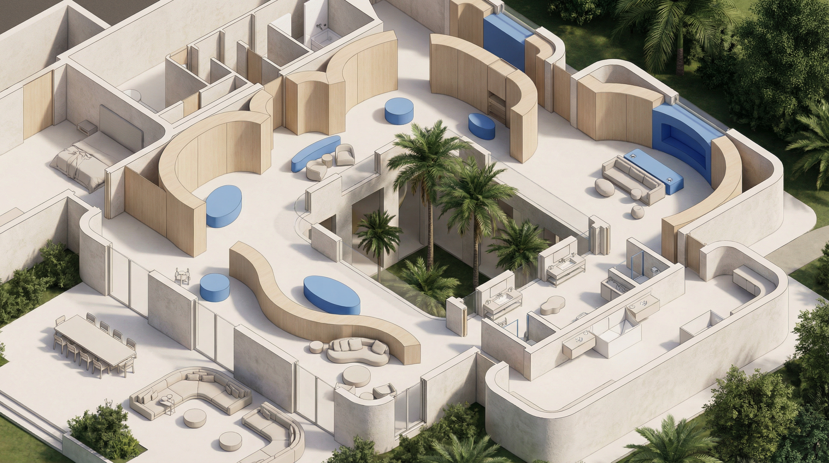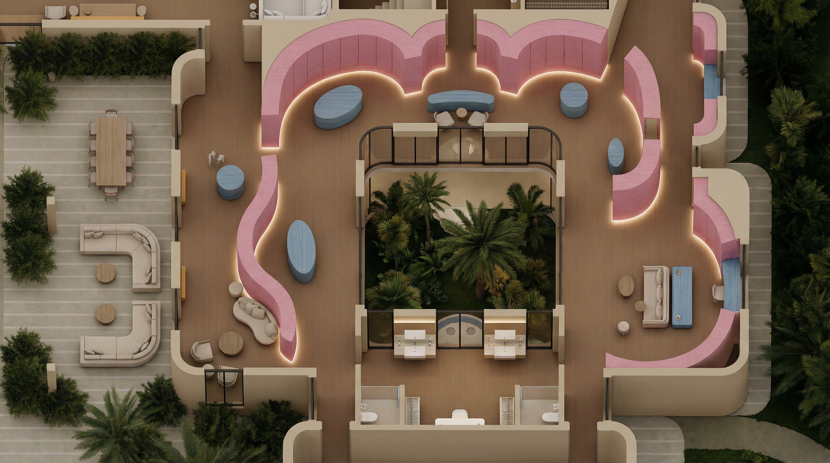convert this floor plan into a realistic isometric 3d view of a full house show the space from an elevated angle with furniture walls and details visible use the attached floor plan image as a strict spatial reference generate a 3d interior rendering emphasizing the relationship between interior closets and the open air courtyard courtyard fully open to sky dense palm planting acts as the primary source of daylight architecture large glazed openings between interior and courtyard light penetrating deep into the space reflections on millwork and floors lighting quality soft tropical daylight dappled shadows from palms goal express openness calm and continuity between nature and architecture use the same furniture as shows on the plan do not change the orientation of the floorplan