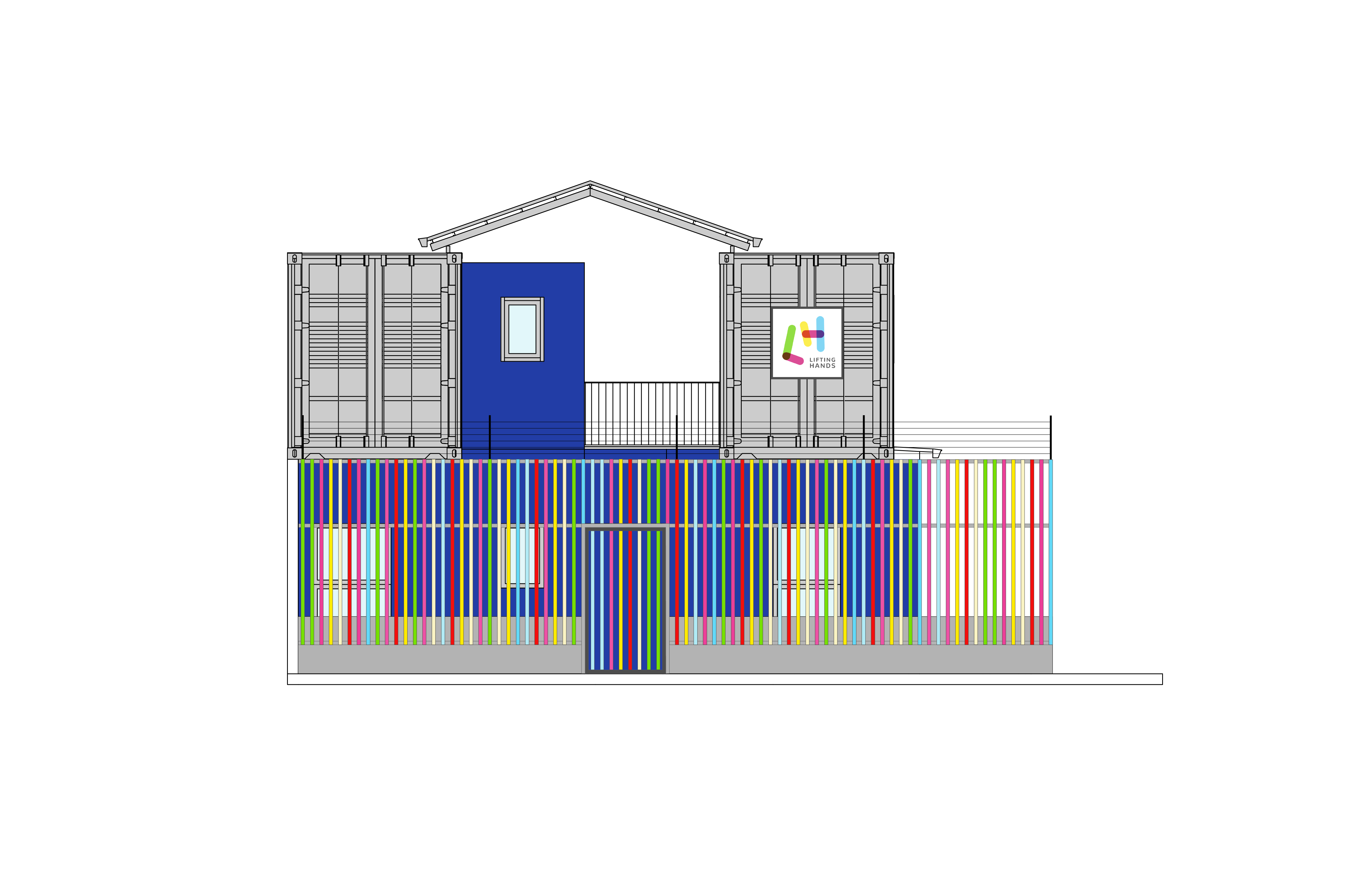 photorealistic architectural rendering of a contemporary school facade frontal elevation view perfectly aligned to the provided 2d architectural drawing follow all lines proportions geometry and colors exactly as shown in the 2d drawing no design interpretation or variation clean modern lines light neutral exterior materials as specified bright natural daylight soft realistic shadows minimal urban context no people ultra high resolution professional visualization quality the central void in the second floor is open no windows
