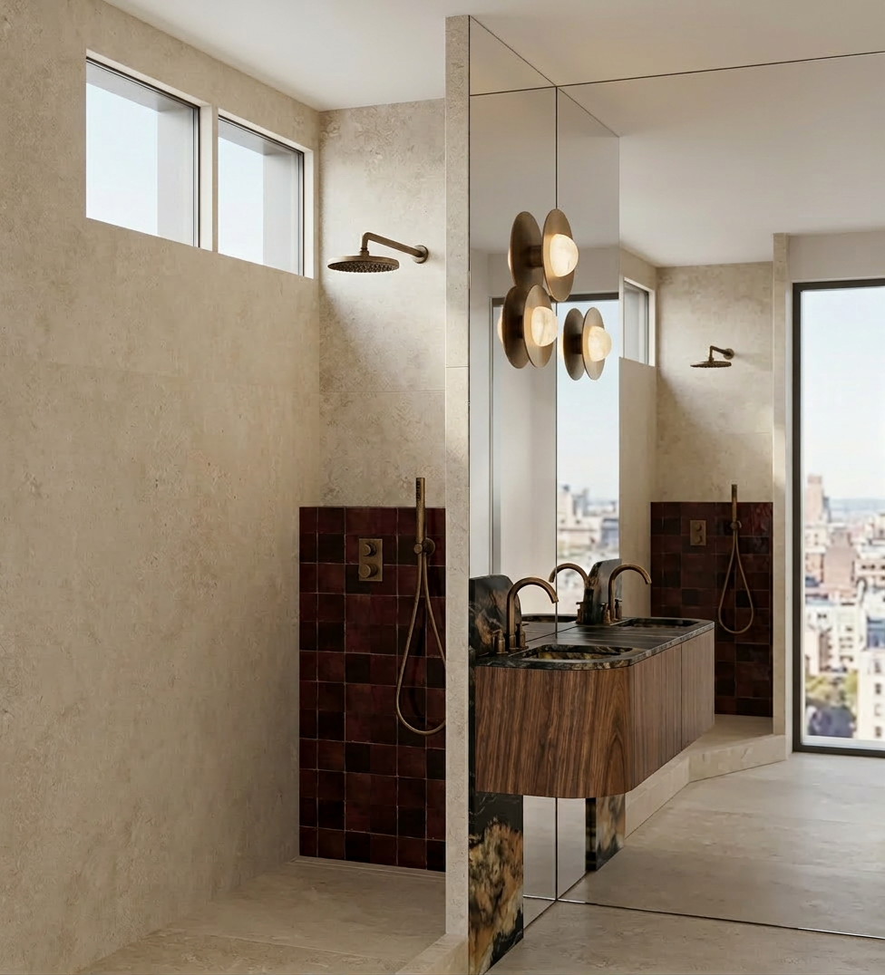 the walls in the shower are covered with marazzi mystone tivoli beige tiles the wall lights are the median model from apparatus studio in alabaster the dark stone is black fusion quartzite the fixtures are in bronze the small square tiles are zelige in dark bordeaux tiles like this https www terredezellige com produit mosaique terre de zellige 3x3 cm sur plaque de 30 5x30 5 cm 07 marron fonce the wall on which is affixed the vanity and the wall lights is fully in mirror there are no fixtures on the wall beneath the window the bathroom is on the 6th floor the floor under the vanity is in the marazzi mystone tivoli beige tiles the walls other than the wall is in the shower are in light beige there is only a small window on the top of the wall it is a small bathroom