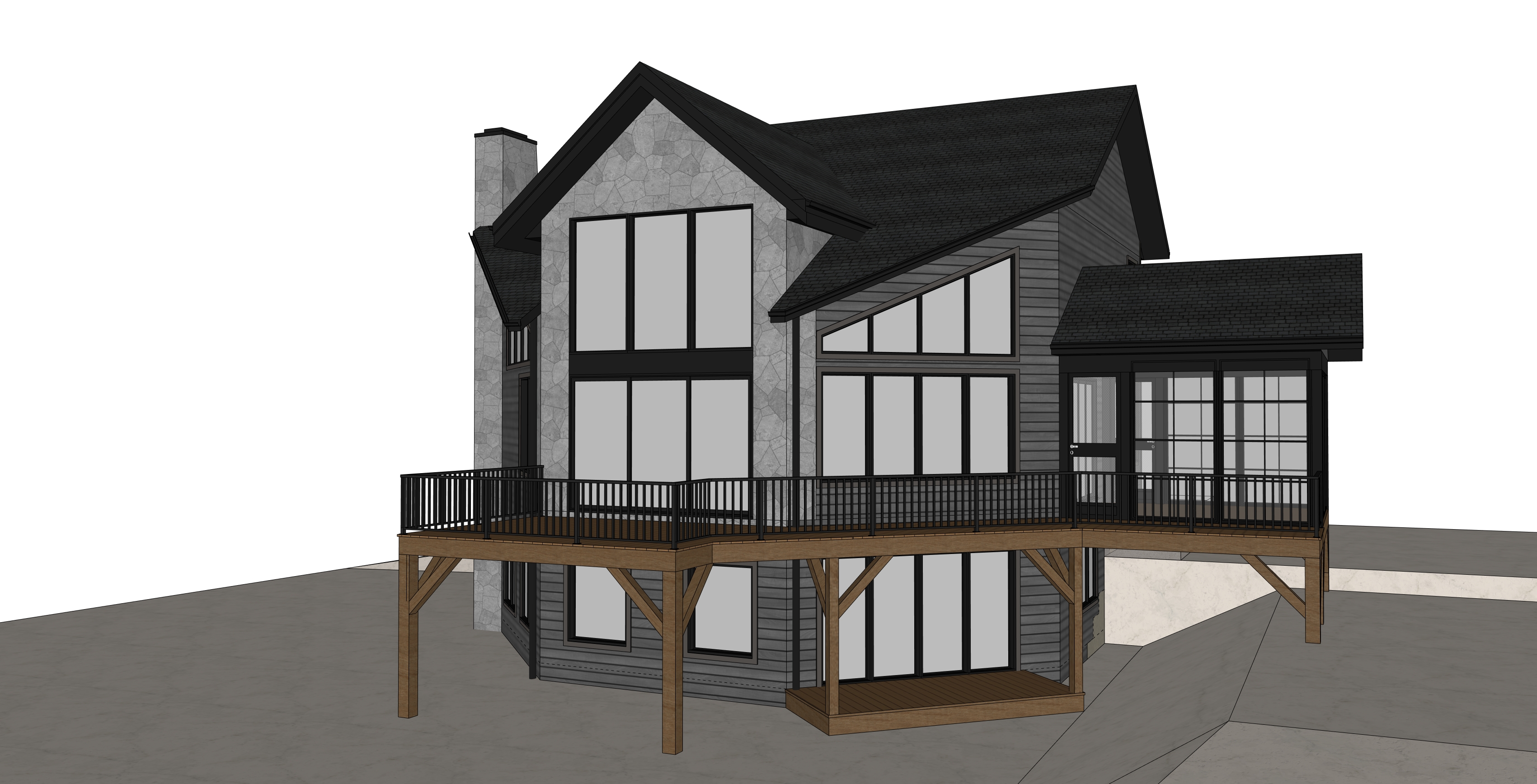 cabin is set in the boreal forest with canadian shield stone at the base trees in the background light tree cover in the background season is summer facing a lake that is in the foreground