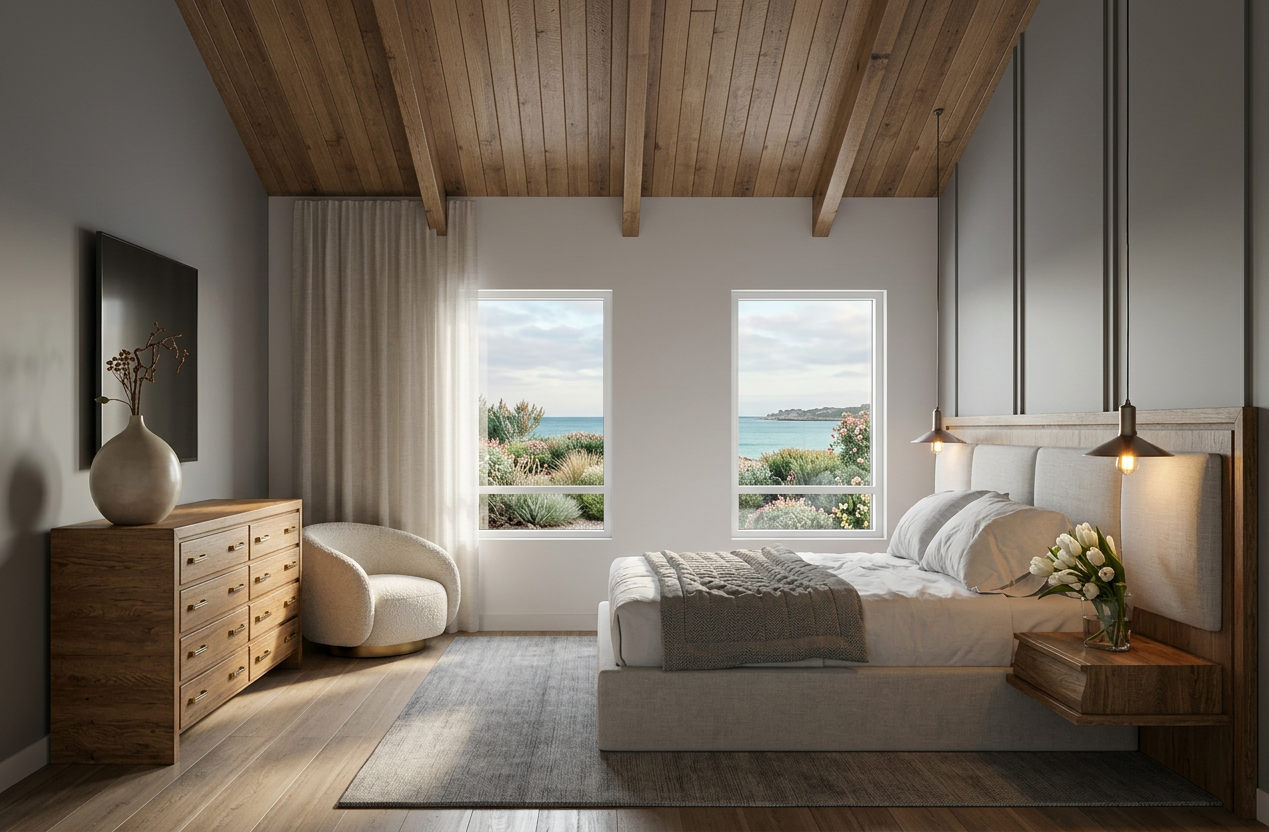 the rendering looks real and natural with a japandi style concept without changing the material shape and size of the image off white wall paint color white ceiling cream wood vinyl floor wooden frame and fabric material wardrobe doors brown fabric bedframe in left is door not window add indirect light at shelf and back of mirroe