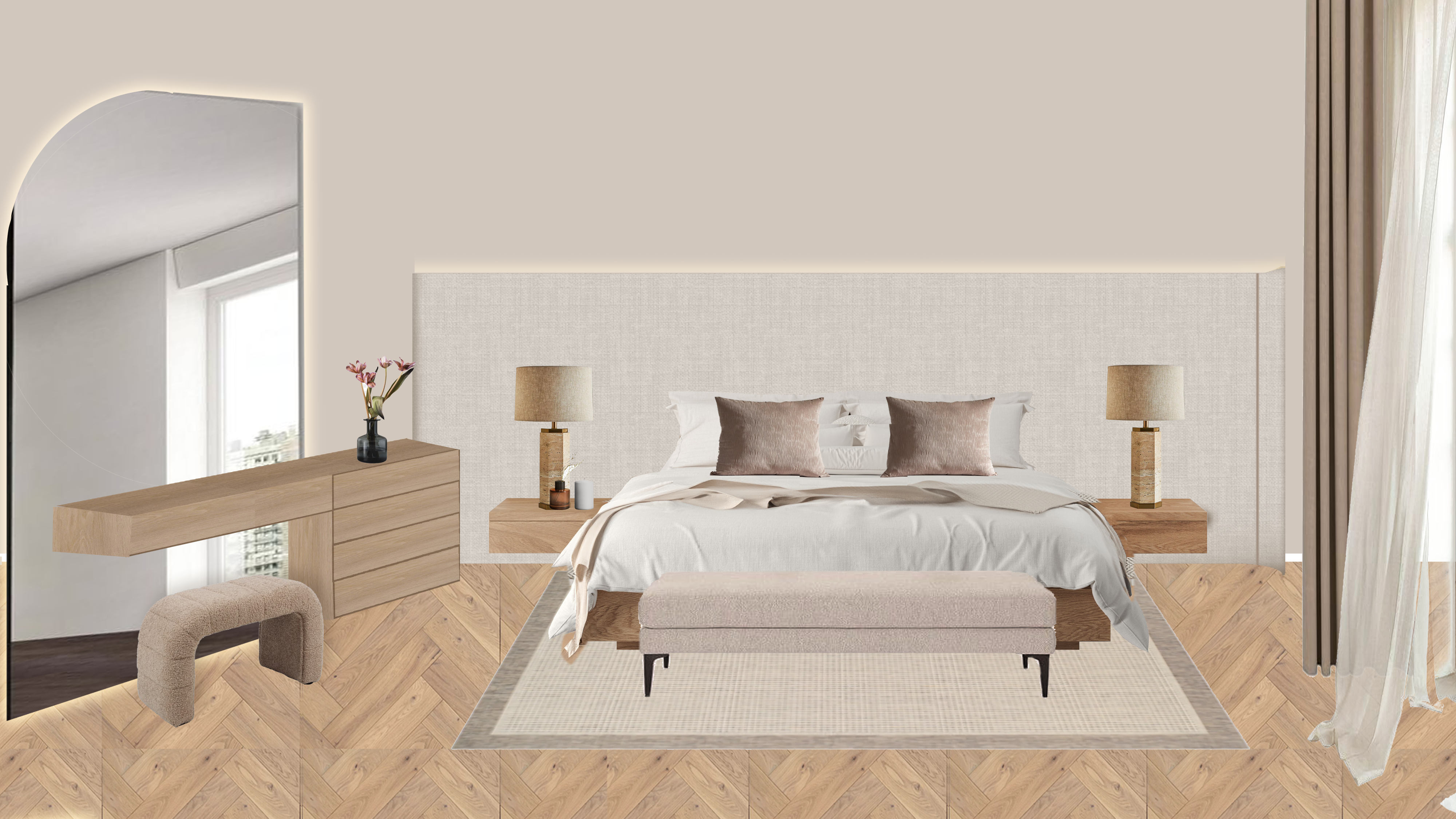 render a very photorealistic 3d perspective of this bedroom add sun light and hidden light in the ceiling quality 8k resolution don t change the material only enhance the texture and make it more realistic