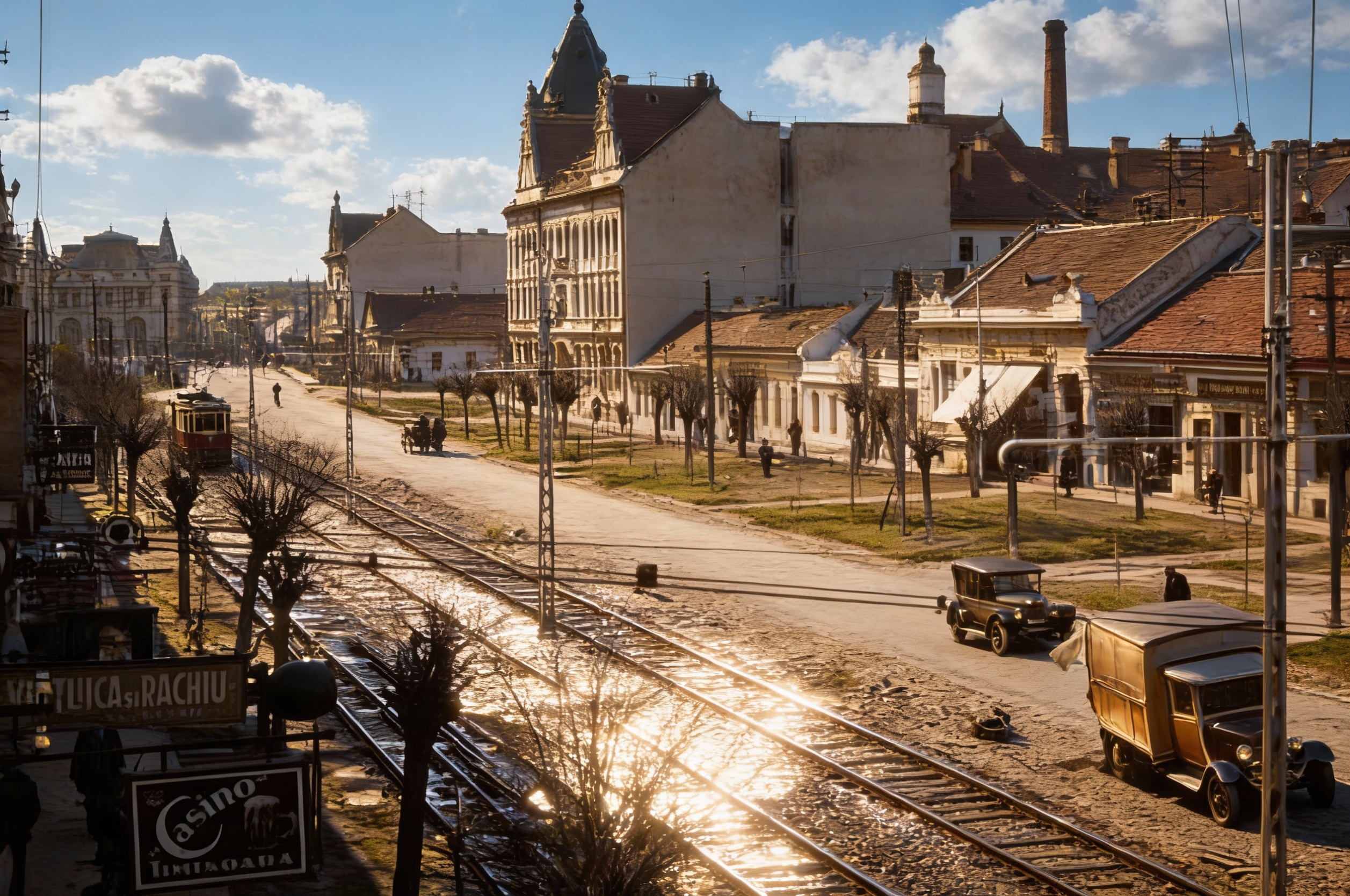 1900 s style atmosphere beautyful clouds clear high picture exposure enhanced details remove texts the picture stucco fassade color cinematic hyperrealistic view