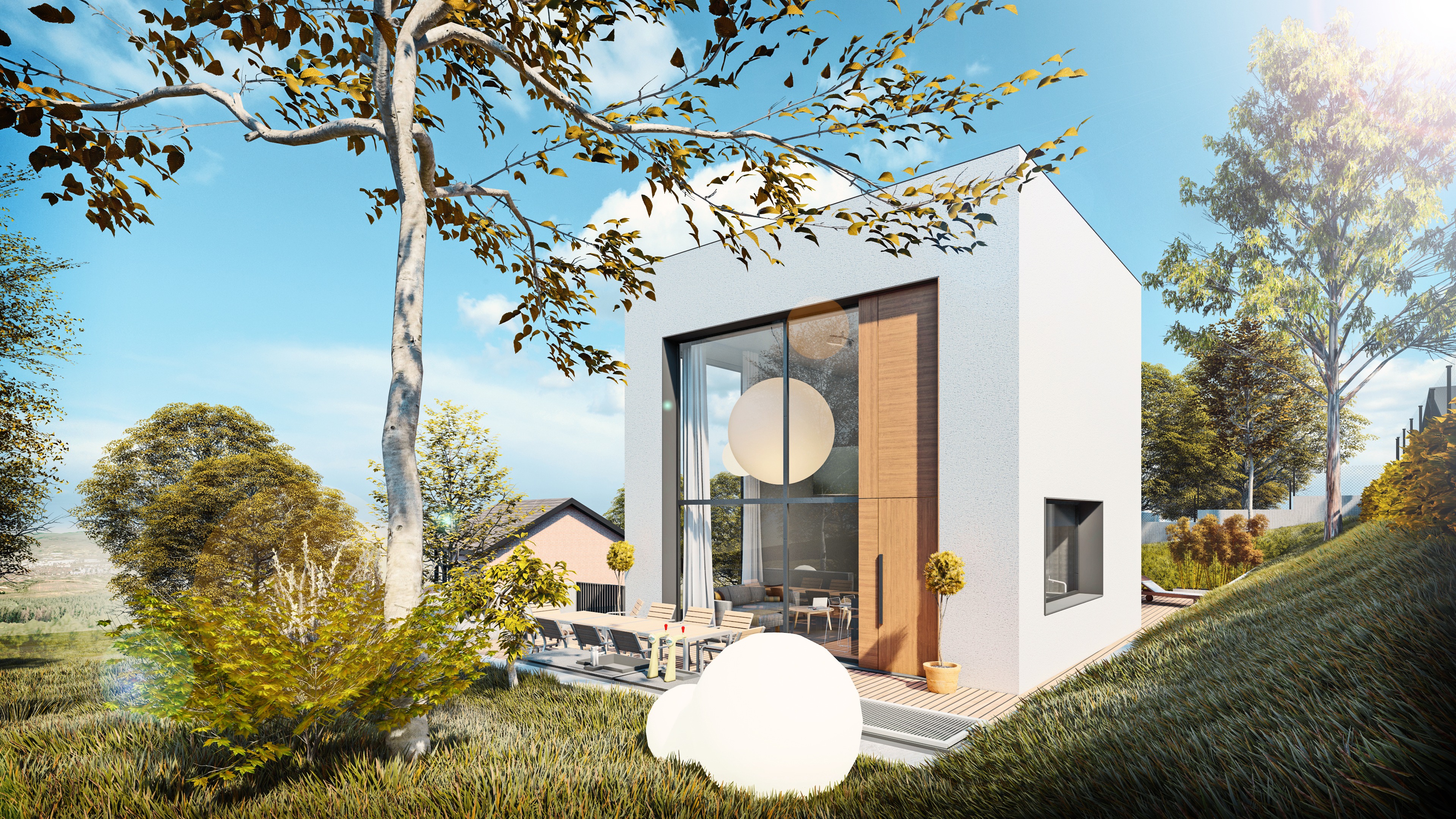 important preserve the existing geometry and the existing context exactly as provided do not modify alter reinterpret add remove scale or reshape any geometry do not change the site surroundings street layout neighboring buildings vegetation or context elements do not modify geometry scale proportions buildings road layout sidewalks or surrounding context in any way do not change text photorealistic architectural rendering clean and balanced contrast calm cinematic mood style contemporary european residential architecture minimalist premium understated do not alter the church color soft overcast noon atmosphere diffused natural daylight with subtle blue grey tones cinematic architectural mood large glass surfaces with realistic reflections soft mirror effect subtle environmental reflections of sky and surroundings wet pavement with smooth reflective surface soft light bounce and blurred reflections high dynamic range lighting realistic global illumination soft shadows calm and minimalist nordic mood photorealistic architectural visualization balanced exposure no harsh highlights add interior warm light do not add windows do not add windows do not change the materials keep the wall on the ground floor remove the wet pavement do not change the wood on the facade