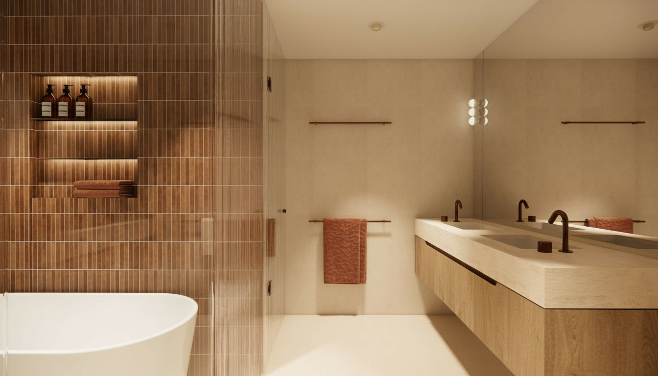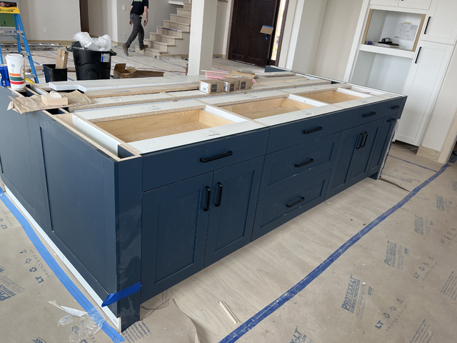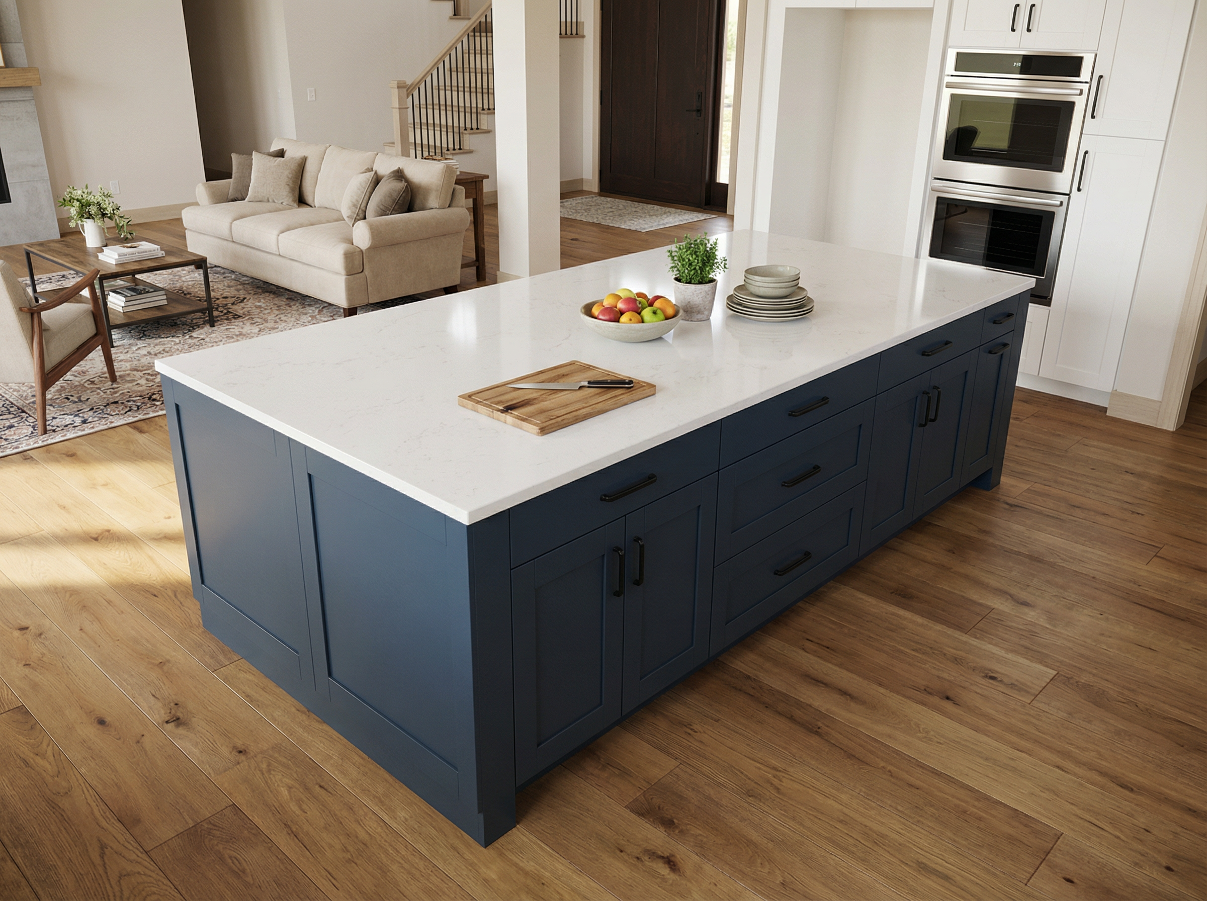 do not change the cabinets in any way preserve the exact cabinet colors materials finishes dimensions door and drawer styles hardware spacing alignment and all geometry exactly as shown do not alter the countertop shape backsplash appliances flooring lighting fixtures or wall structure only remove the construction materials clutter and mess from the scene clean the room and make it look finished and staged add a few simple tasteful home accessories appropriate for the style of the space but do not add or remove any furniture windows or architectural elements maintain the original lighting direction and realism enhance clarity and polish the photo while keeping the cabinetry and room design completely unchanged do not alter the lighting to keep the cabinet colors as they are in the image add new flooring and countertops stage the countertops for a kitchen put a living room in the background put double ovens in the white cabinet opening keep the cabinet colors as they are