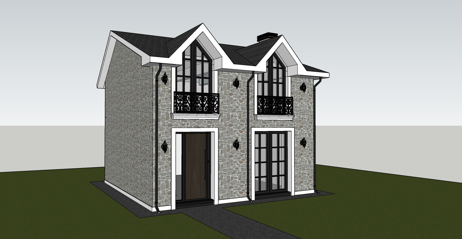 mountain house surrounded by natyral shrubs and pine forest realistic natyral light soft shadows