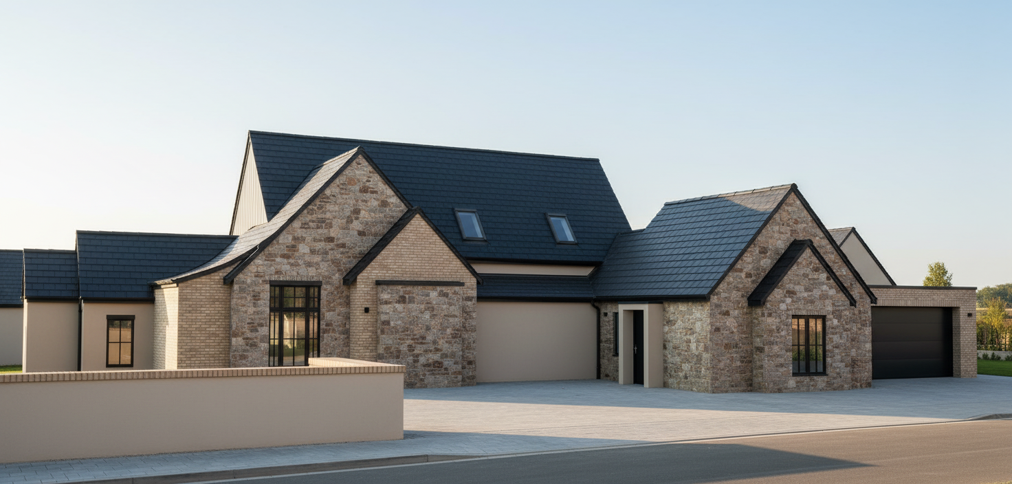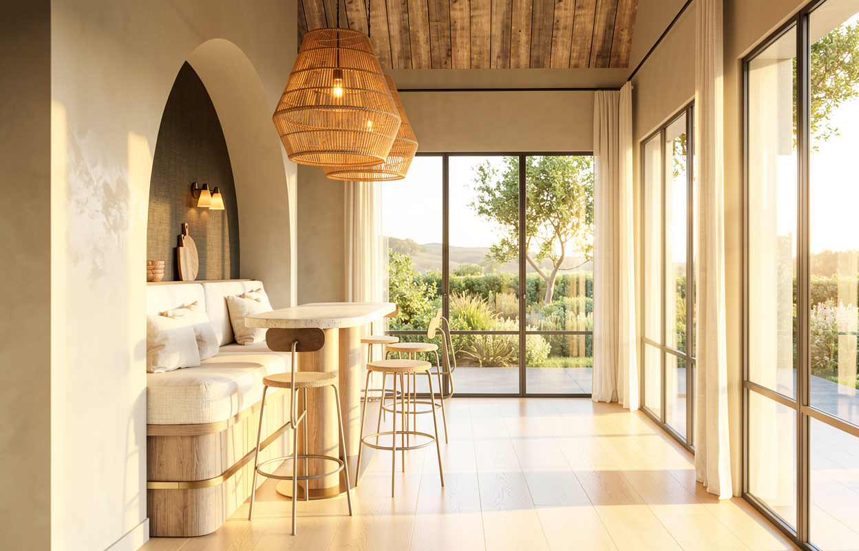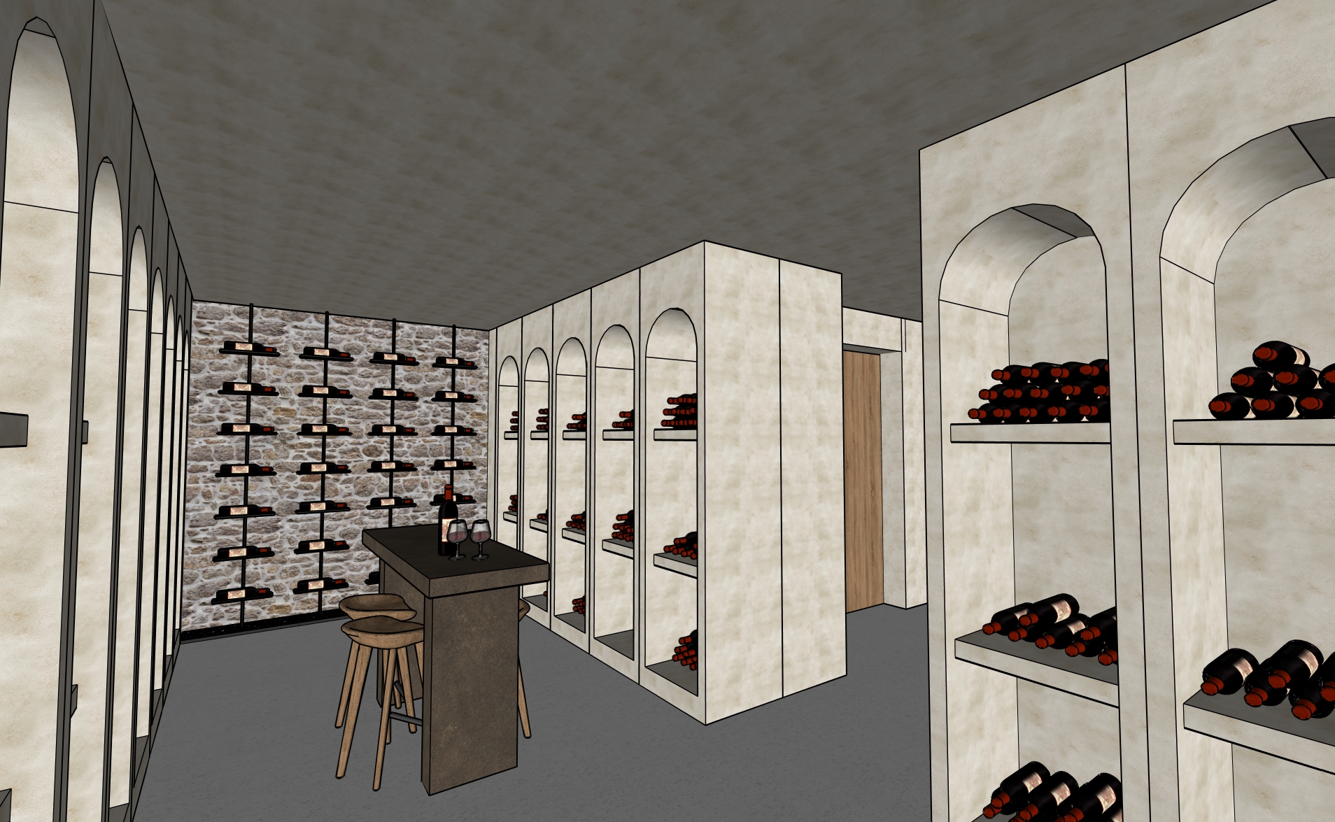 a photorealistic architectural rendering of an elegant wine cellar with arched wall niches displaying wine bottles stored horizontally the space features soft beige lime plaster walls and a flat straight ceiling finished in the same lime plaster creating a seamless continuous mineral surface the floor is finished in smooth grey beige polished concrete adding a refined contemporary atmosphere along the back wall a rustic natural stone wall is subtly highlighted by a warm led backlight at its base revealing small decorative pebbles placed along the floor line built in arched niches are softly backlit to illuminate the bottles and enhance the depth of the alcoves at the center of the room a solid brown grey stone tasting table stands with natural wooden stools two discreet ceiling spotlights focus warm light onto the table creating a central focal point the wine racks and niches maintain the same layout and materials with bottles stored horizontally throughout the space a simple wooden door is visible in the background the lighting is warm and atmospheric emphasizing texture depth and material realism with cinematic shadows soft reflections and high end interior photography quality the ceiling remains perfectly flat and horizontal preserving the original proportions of the space