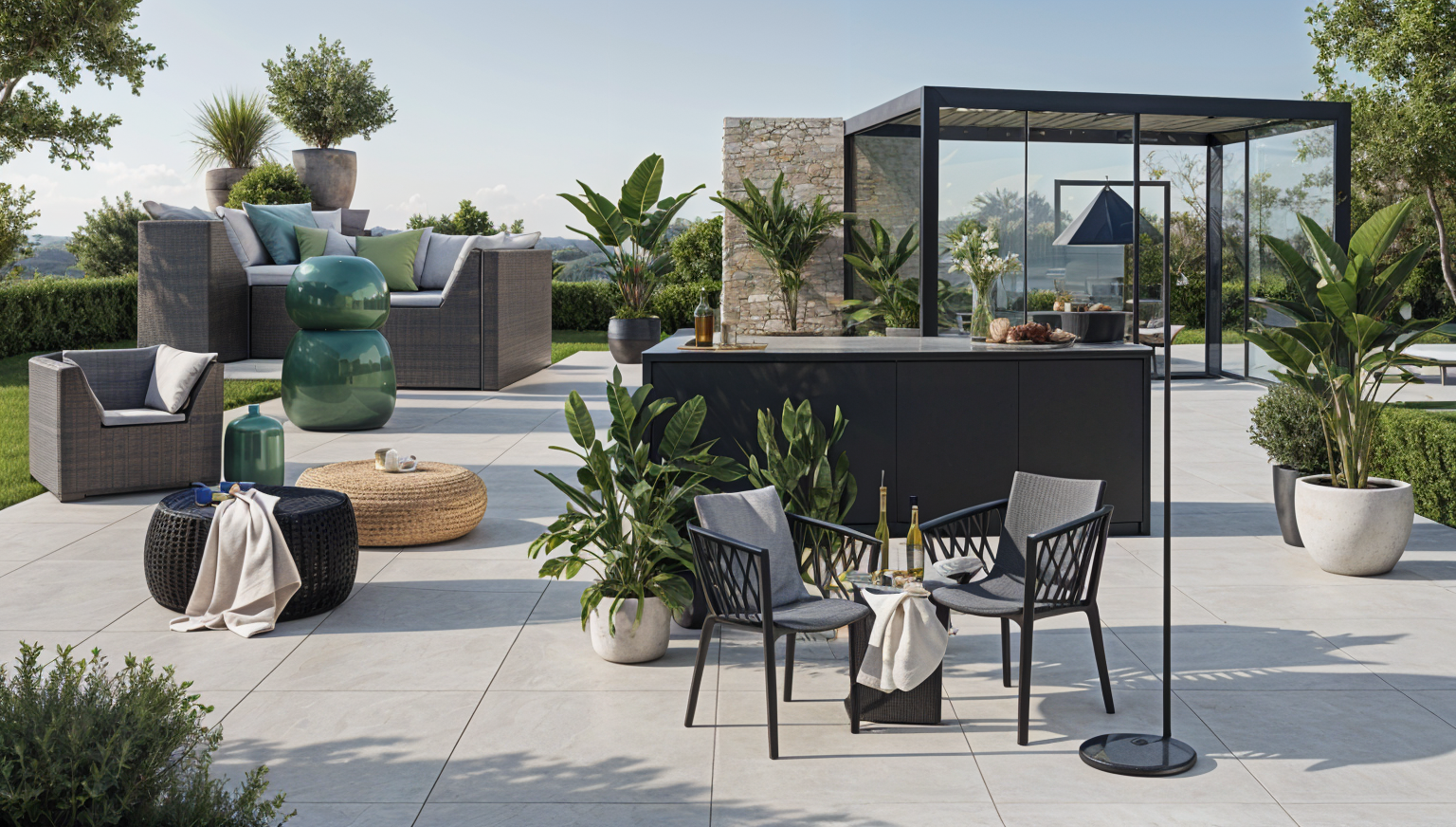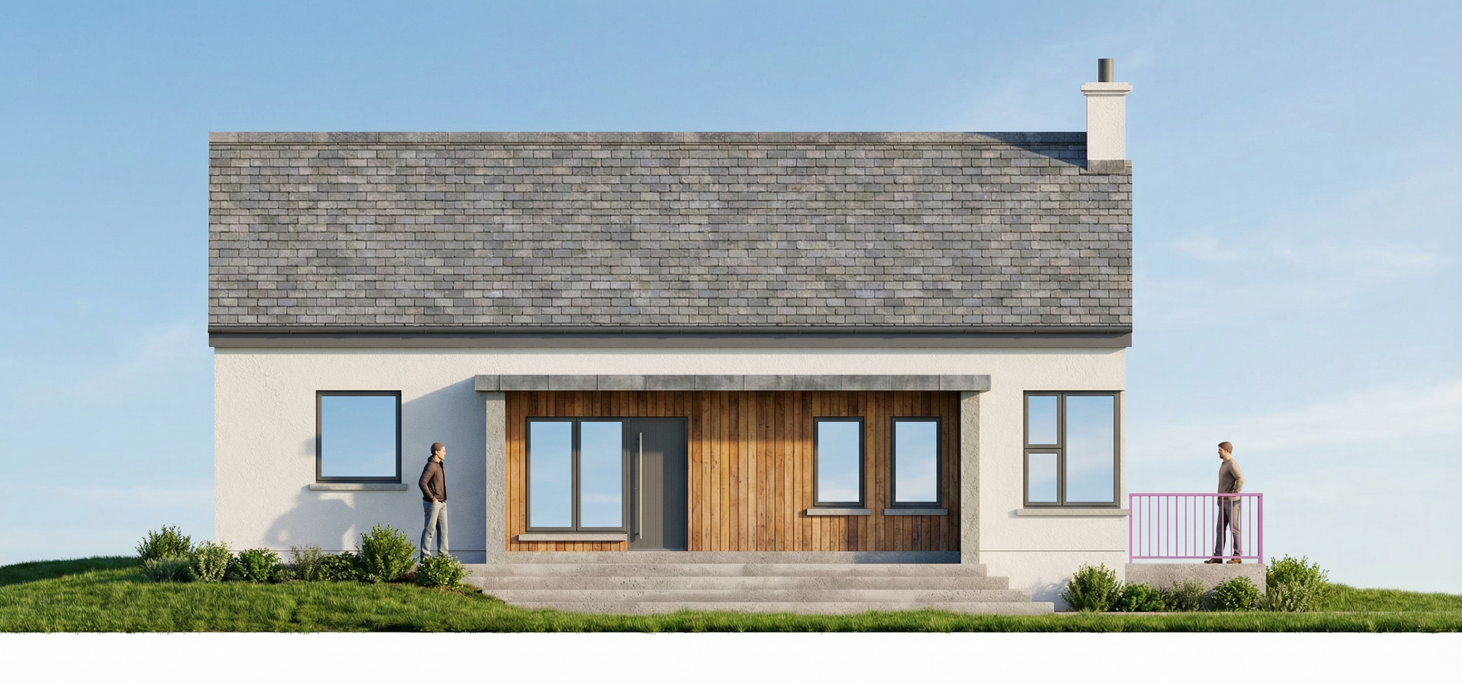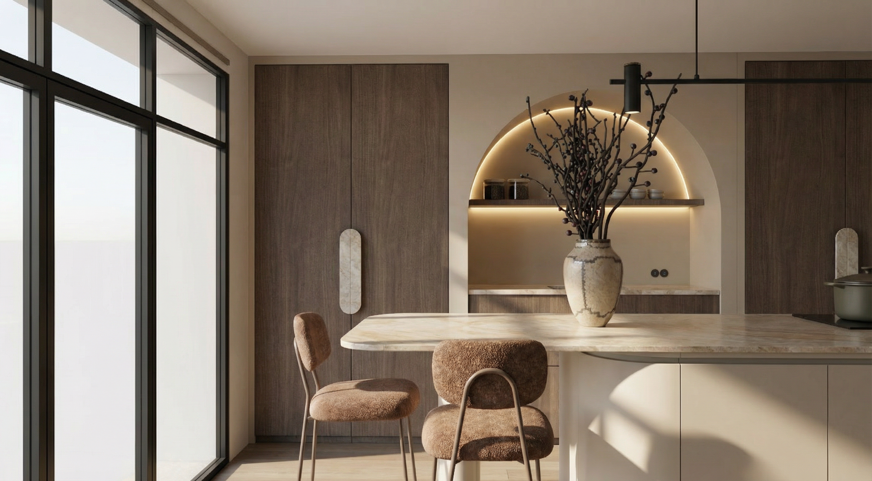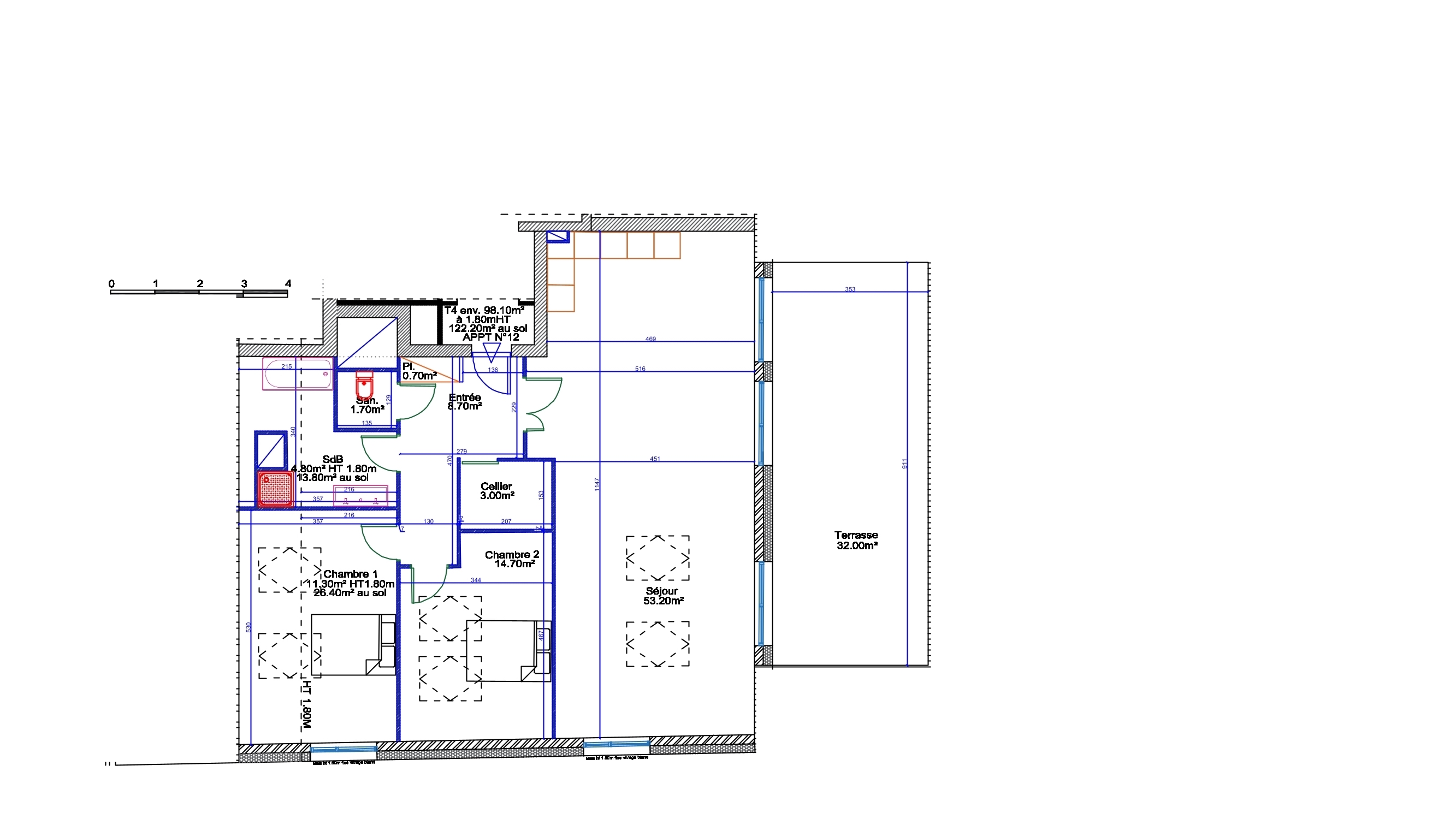 convert this floor plan into a realistic isometric 3d view of a full house show the space from an elevated angle with furniture walls and details visible a warm atmosphere light wood flooring in the bedrooms and large light colored tiles in the living areas a light colored sofa a fully equipped kitchen a cozy ambiance without too much color use the same furniture as shows on the plan do not change the orientation of the floorplan