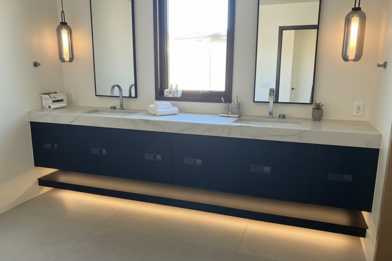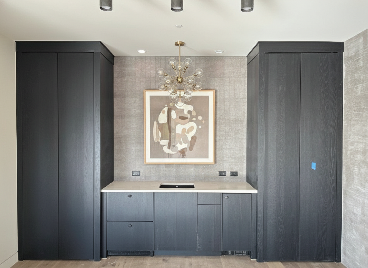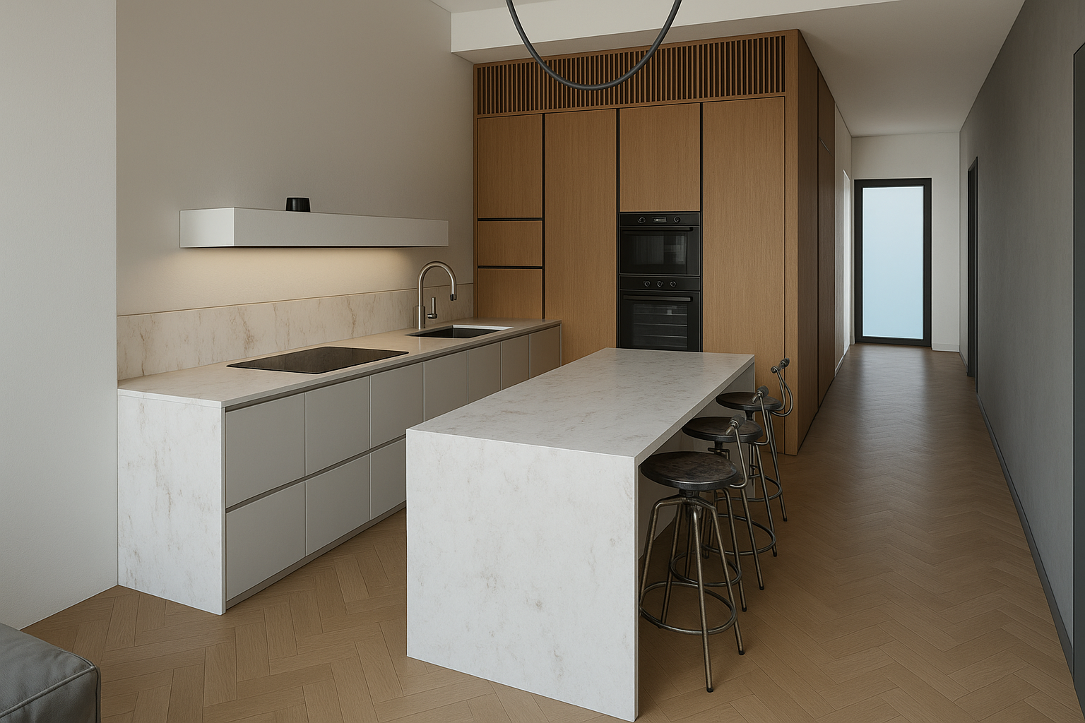 interior shot lighter floors chairs all chrome no skirting boards needed led trip lamp above island smaller gaps between cabinet doors mirror on the hallway right wall spot light in the hall ant above tall cabinets through the window show a cobblestone yard about 5m long and a fence with greenery behind it