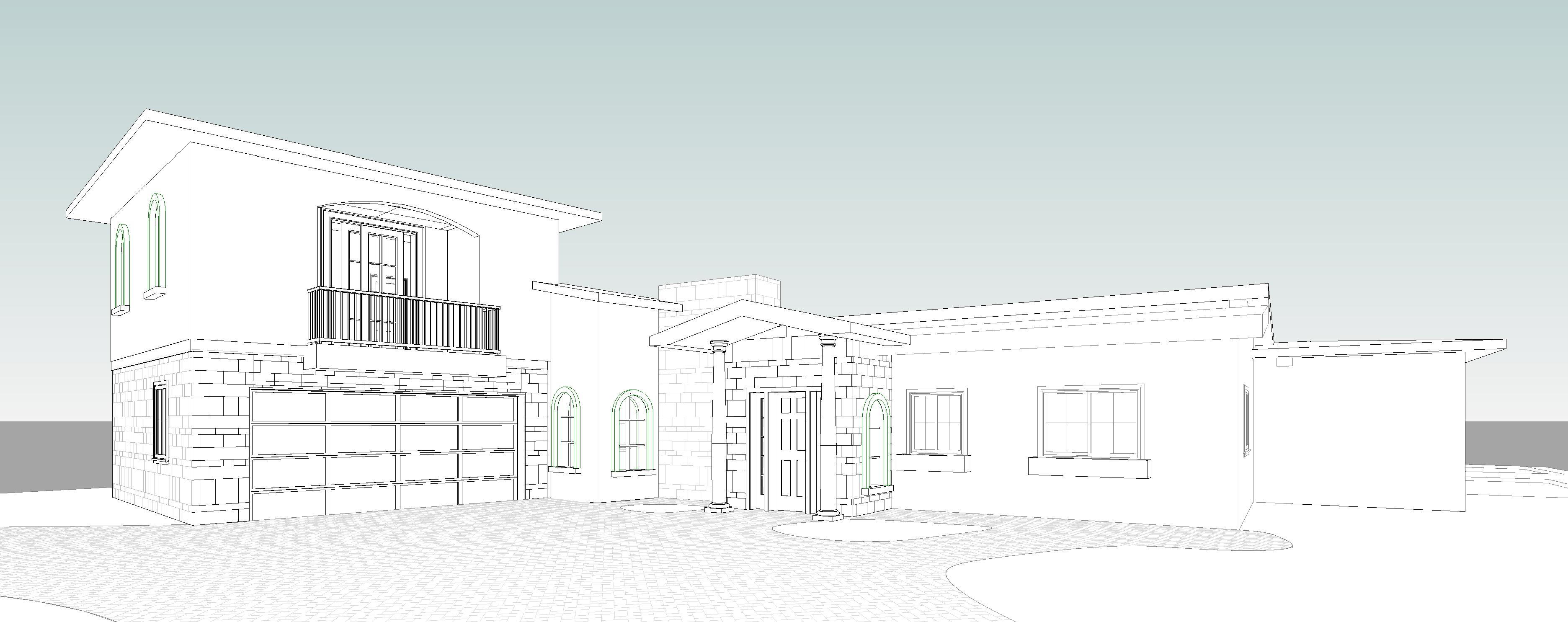mediterranean revival exterior shot a modern mediterranean style villa exterior bathed in warm golden sunlight location in us florida the walls are a creamy light white textured stucco with elegant terracotta roof tiles standing seam metal roof on shallow slopes the front door is a rich oak brown accented by decorative wrought iron add accent limestone veneer on the chimney by the main entry door the windows are adorned with dark brown shutters providing contrast a cobblestone driveway in shades of gray blue leads up to the entrance lush green landscaping surrounds the house adding a touch of nature the sky is high noon with a few fluffy white clouds creating a tranquil and inviting atmosphere architecture