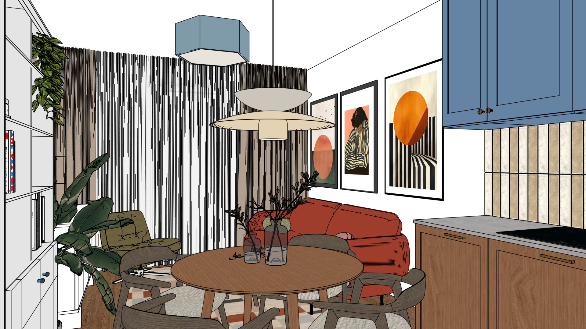 a cozy modern living room with a warm brown wooden dining table and matching chairs a striking red and orange velvet sofa for a splash of color and a classic patterned rug in muted earthy tones contemporary artwork with orange and earthy motifs hangs on the walls blue wall cabinets add a touch of calm and an elegant beige and cream pendant lamp hangs above the table a deep green leafy plant in the corner adds a touch of freshness beige curtains paired with a white net curtain hang in the window the swivel chair is olive green to the left is a white bookcase