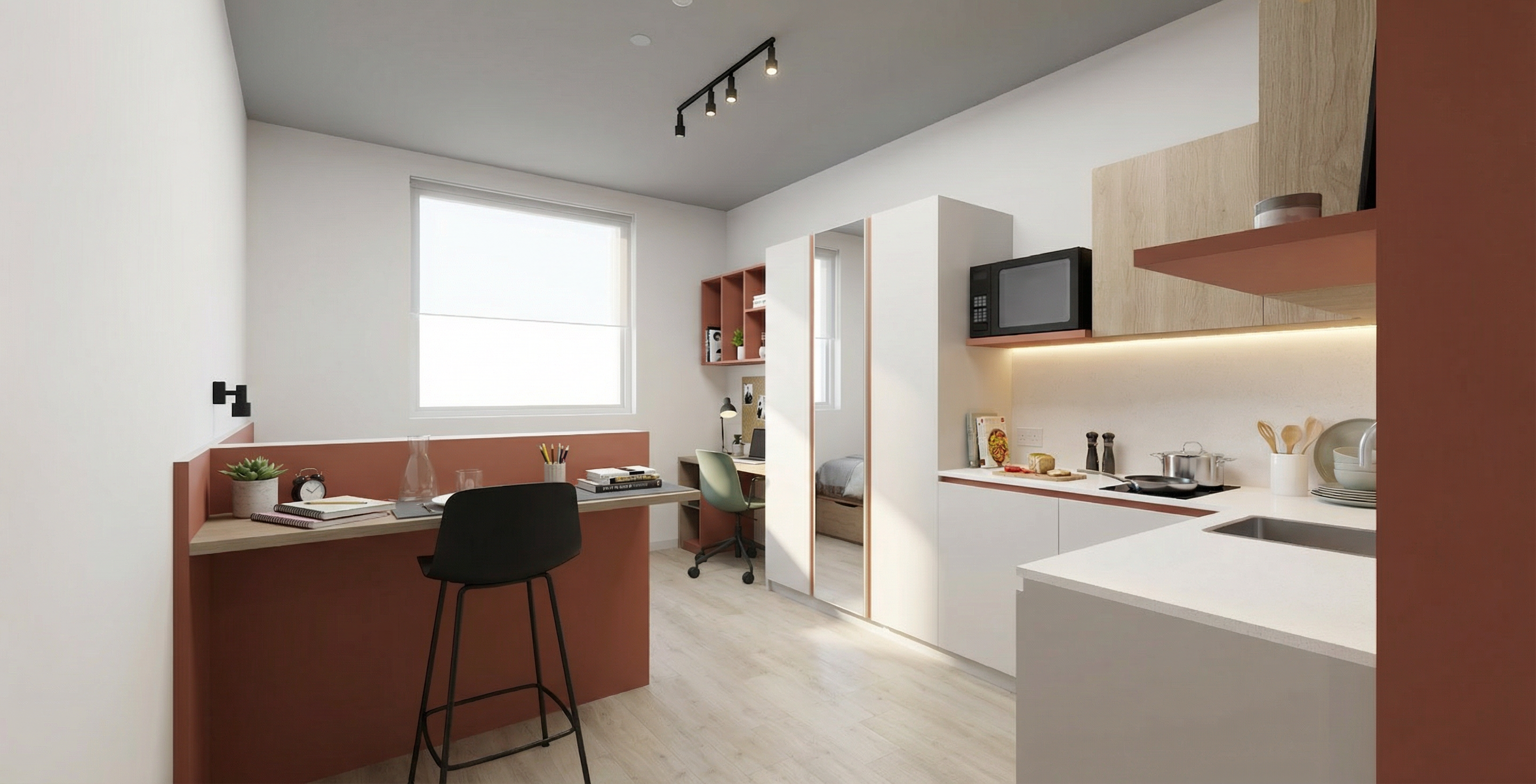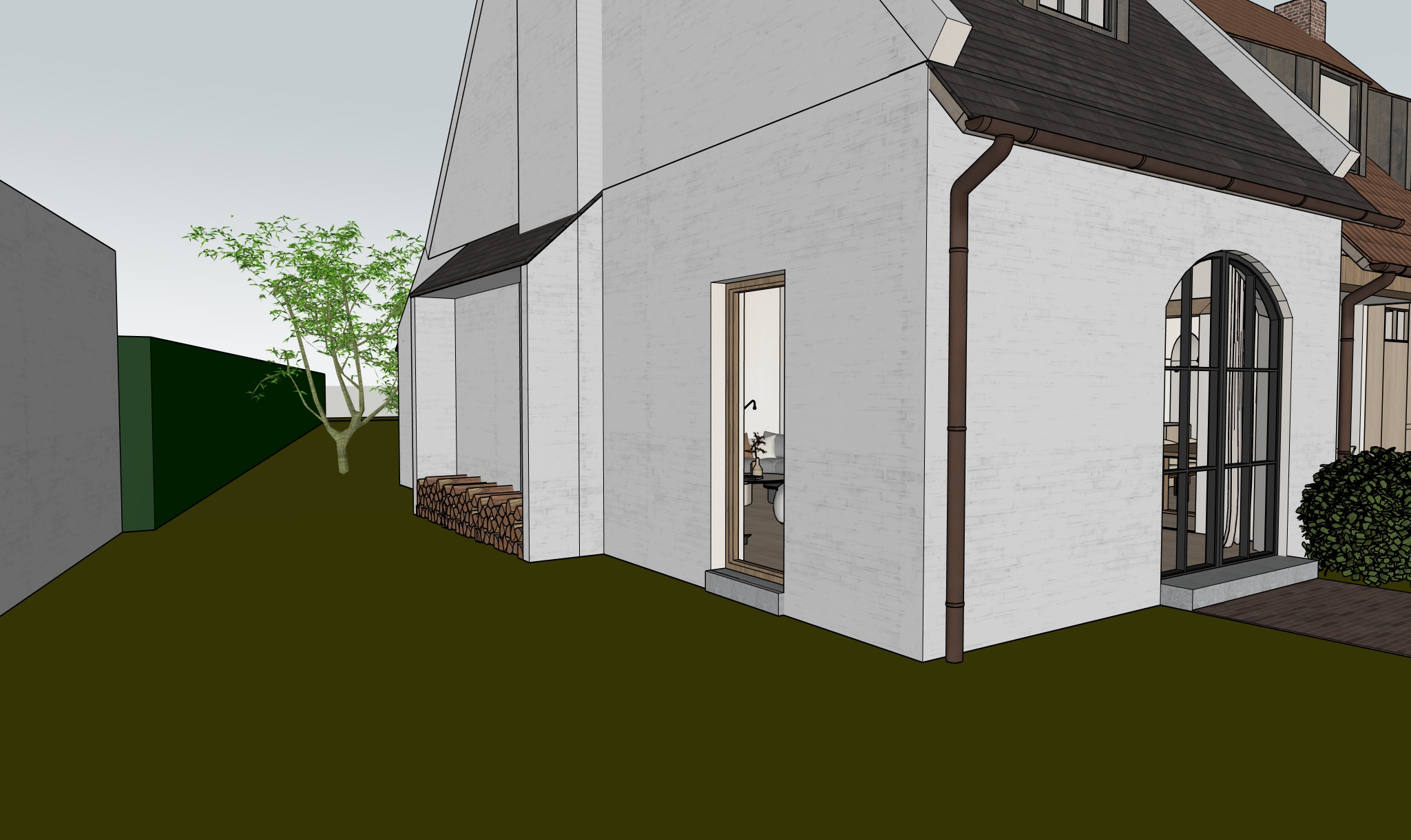 a serene outdoor architectural scene showing a building facade made of white painted brick the composition and color palette are preserved exactly as in the original view the facade features a natural wooden window frame and the roof is covered with dark gray slate tiles the atmosphere is calm quiet and harmonious with soft natural daylight and no harsh shadows in the background on the left side a neatly trimmed green hedge is visible adding depth and balance to the scene the overall mood is peaceful minimal and timeless