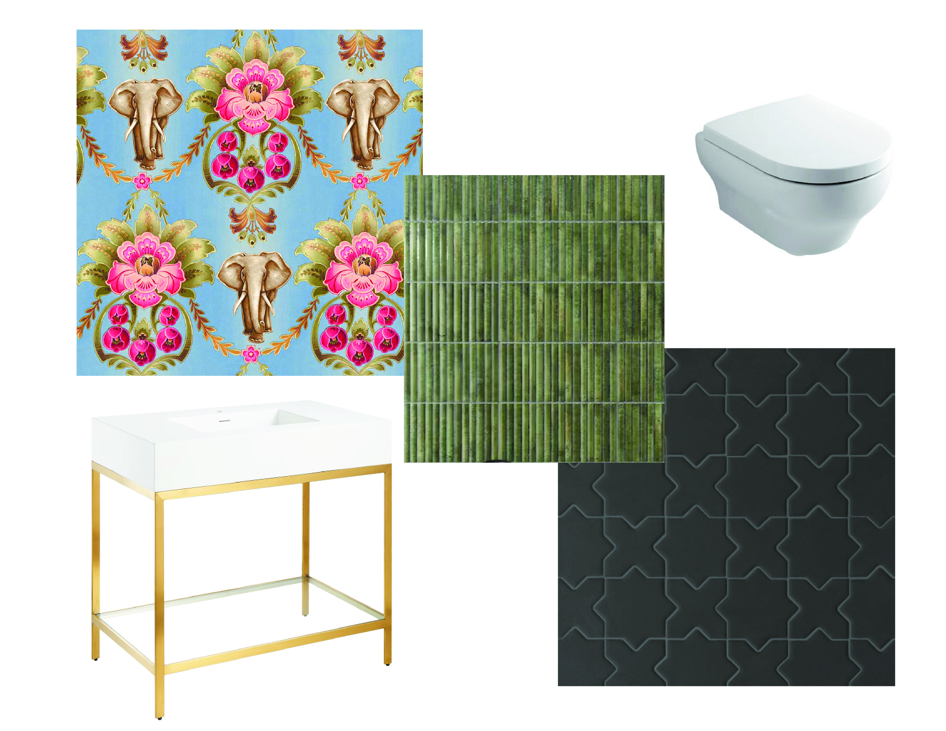 small half bath green tile on bottom half of wall black hexagon tile on floor