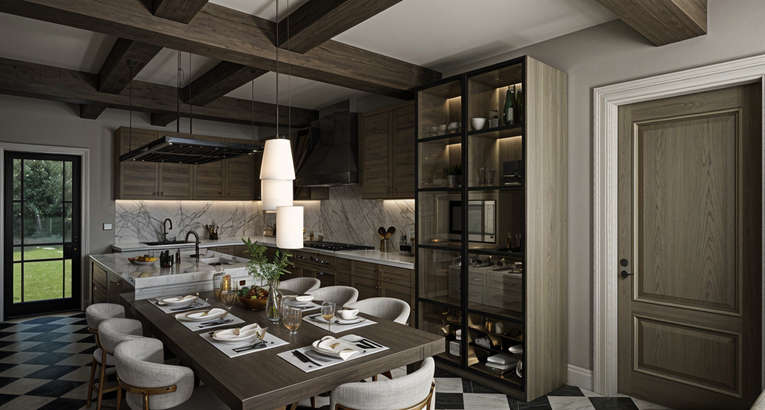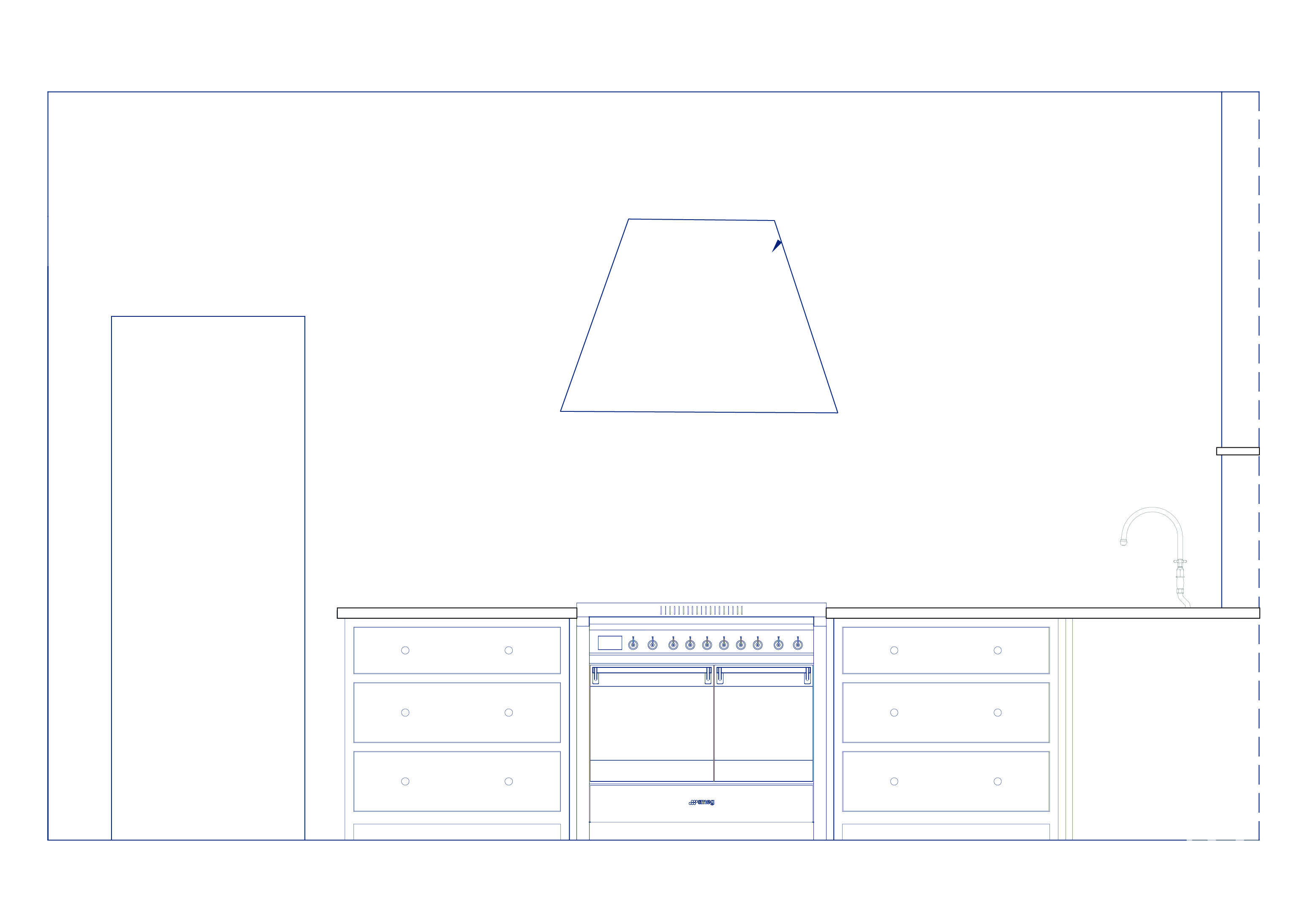 walls in lime plaster in offwhite colour kitchen cabinets in larch wood worktop in dark ebony wood knobs and taps in unlaquered brass the sink is a farmhouse ceramic sink the oven is a freestanding smeg oven in stainless steel the oven hood is in lime plaster