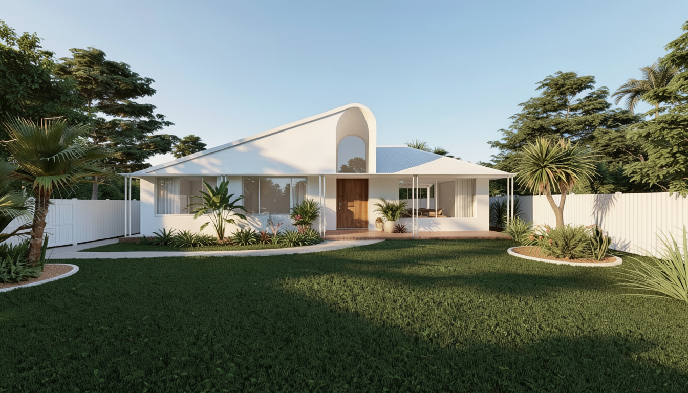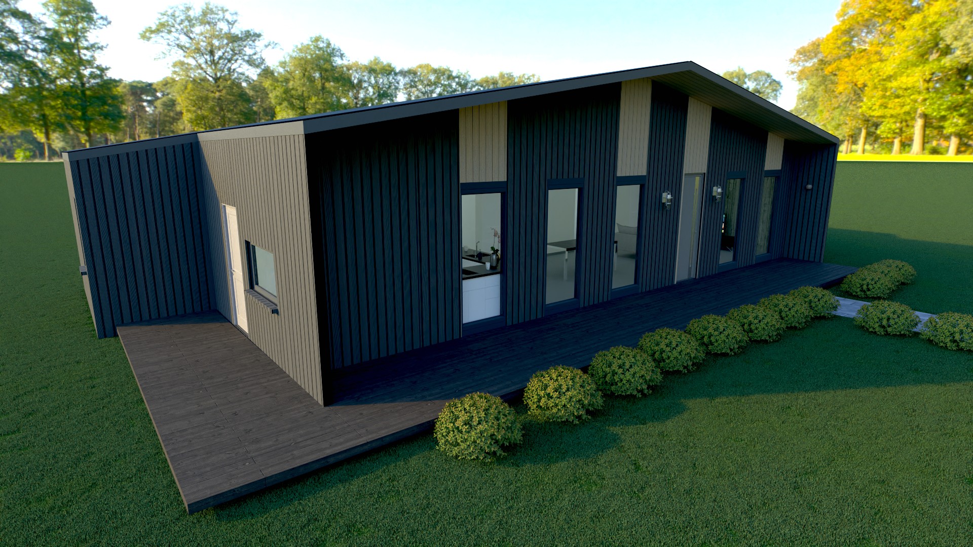 modern minimalist house with a sleek dark grey exterior large windows and smooth lines surround the house with lush green grass and vibrant manicured shrubs lining the pathway add tall trees in the background with soft dappled sunlight filtering through highlighting shades of summer greens and warm golds the atmosphere is serene and idyllic with a calm clear blue sky finish image in hd quality