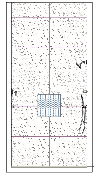 render this shower area realistically using 48 x 24 lightstone traverten with niche as shown in the middle using mother or pearl fan mosaic use stainless steel schluter on all sides of niches