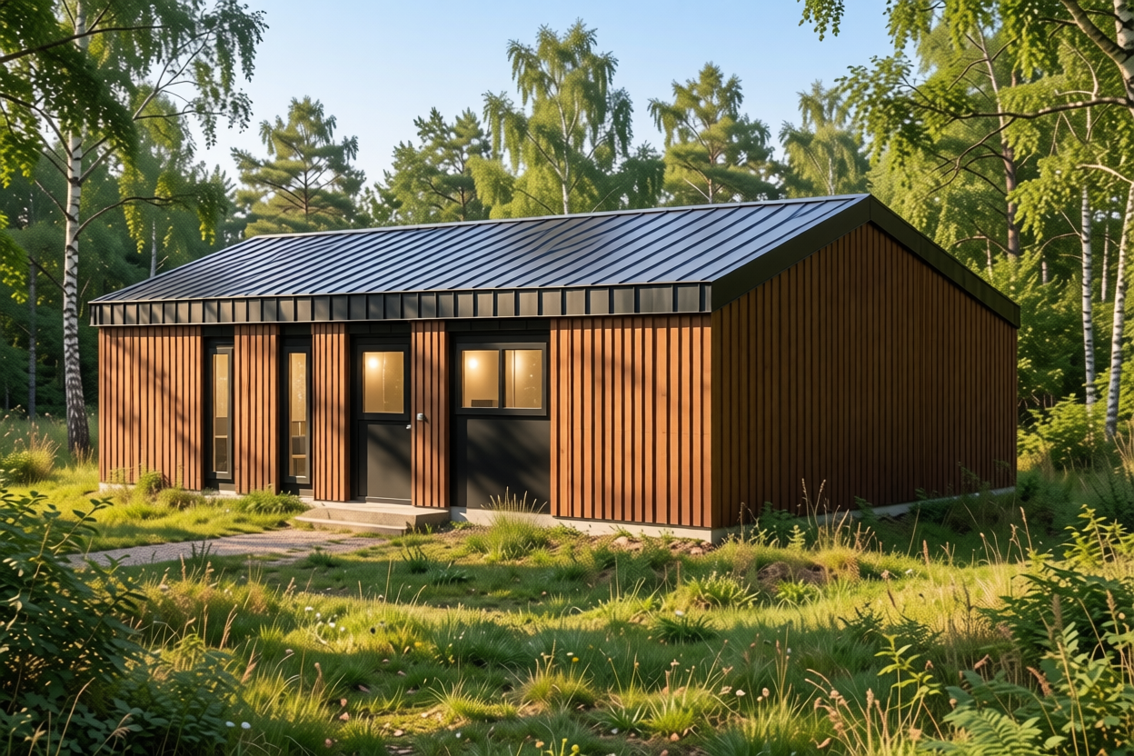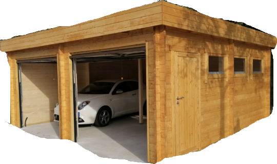 crea un garage di legno da montagna ma di lusso con tetto piano