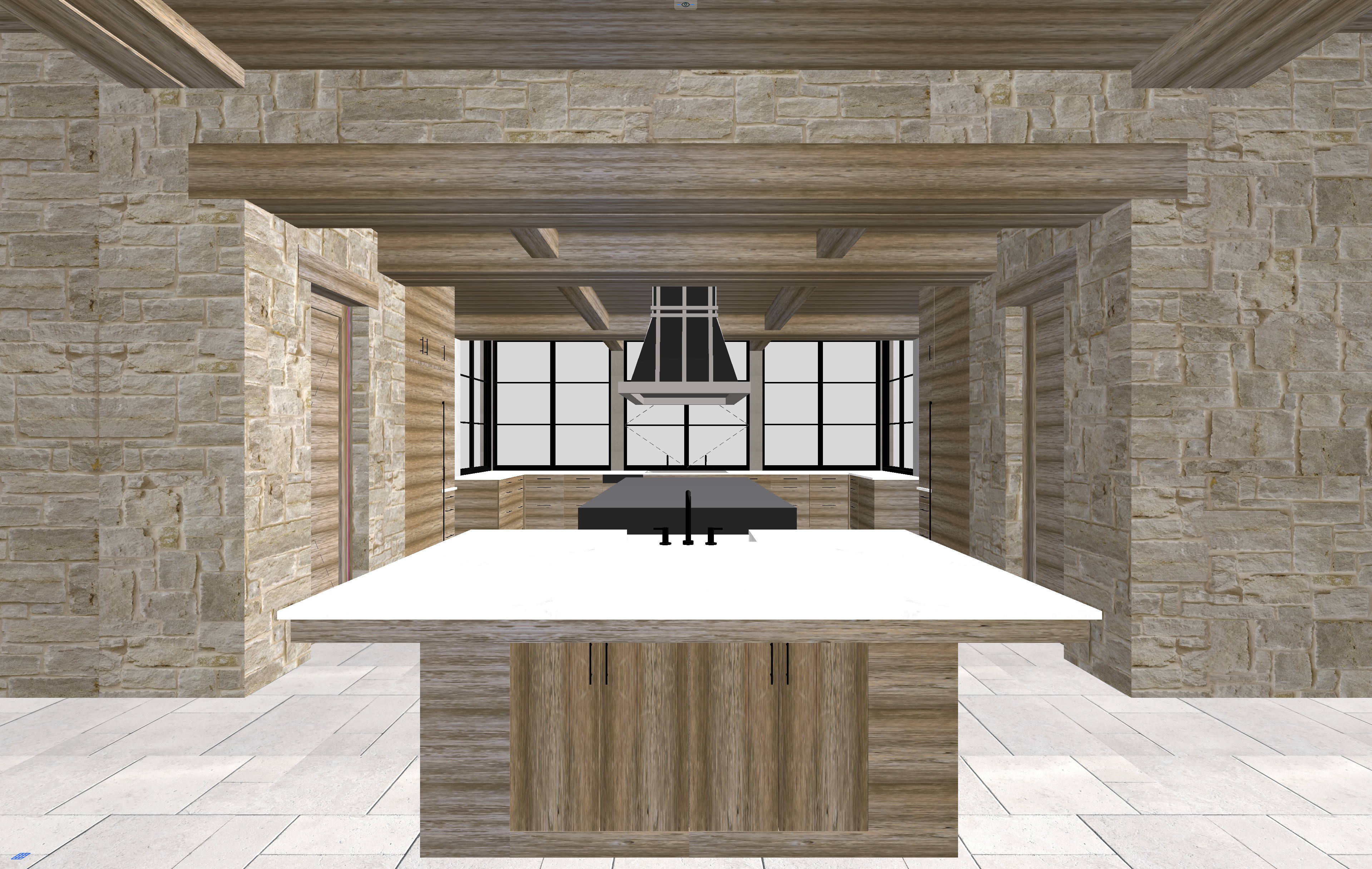 rough cut grandbury limestone antique heavy timber cut limestone steel windows white oak cabinetry la corner cooking island belgian bluestone floors