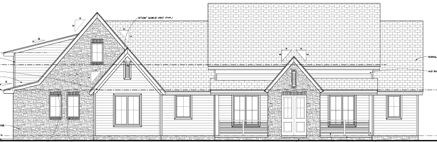 show the image as a real image with a sunset backdrop in a field with moderate amount of trees the horizontal lap siding should be james hardie brands rich espresso color the stone on the house should be el dorado brand cut coarse stone in their seashell color show a driveway around the front of the house with a sidewalk entry up to the front door there should be a strip of landscaping between the house and the driveway