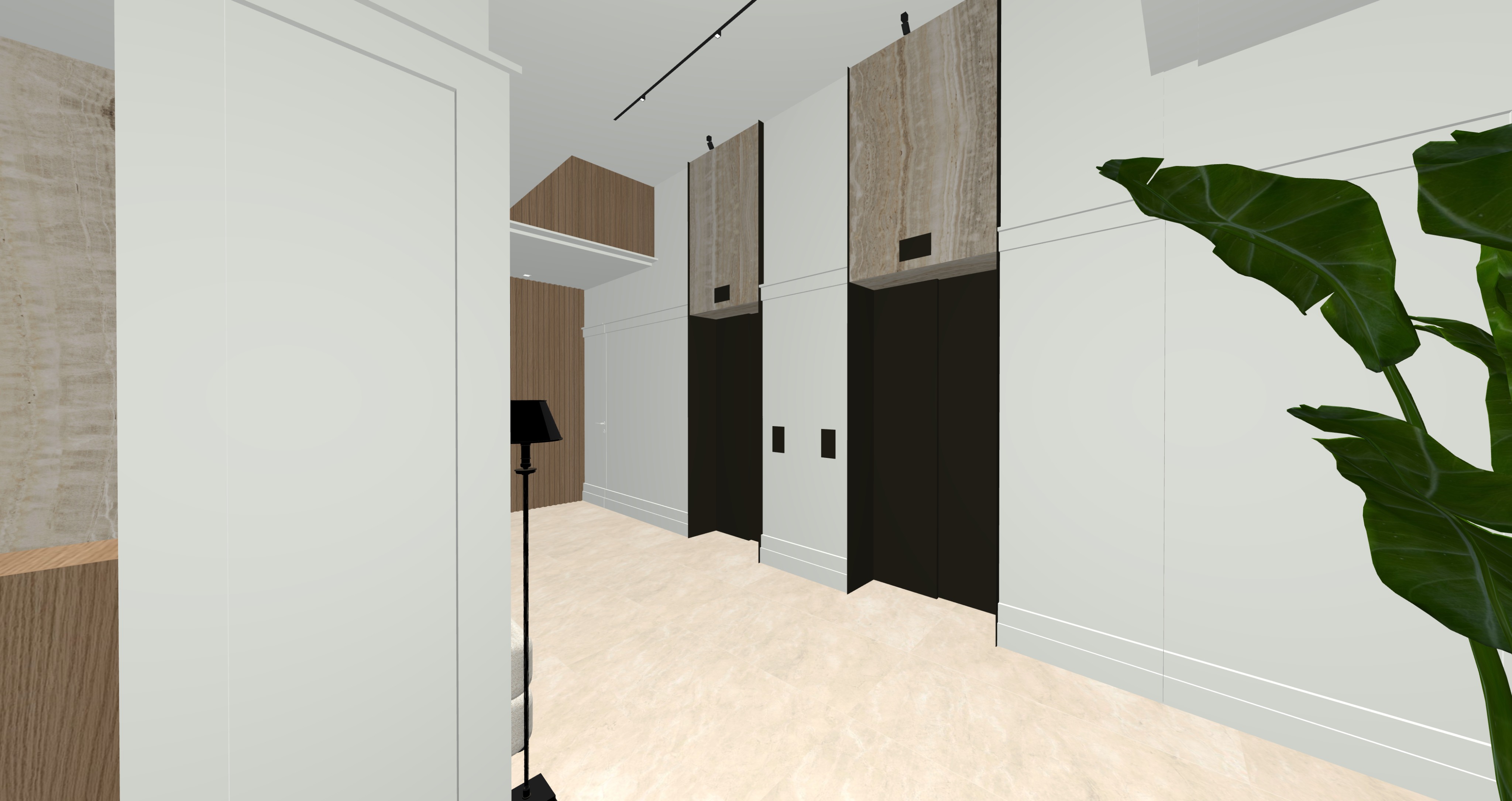 il portale degli ascensori in metallo brunito il rovere leggermente sbiancato la parte chiara bianca calda