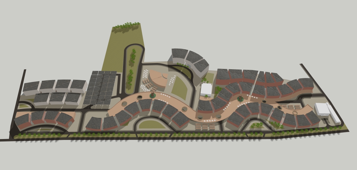 photorealistic aerial architectural render from an existing sketchup 3d city model maintain all original materials and surface definitions from the model asphalt areas remain vehicular roads only the elevated pedestrian boulevard between the front buildings is wooden decking not a road preserve the wood material texture and color exactly and treat it as a pedestrian only space do not add any cars vehicles or traffic elements add pedestrians only correctly scaled to buildings and street width walking and gathering on sidewalks and on the wooden pedestrian boulevard maintain accurate urban scale do not add people cars or bikes buildings retain original massing proportions and placement use natural daylight soft realistic shadows and professional architectural visualization quality camera retain camera as in original picture do not change camera placement show image exactly as it is in the exact angle that is shown do not alter camera placement avoid converting pedestrian surfaces into roads avoid altering or replacing materials avoid introducing new surface types all dark gray coloured roofs are solar panels reduce the solar panel module size so the grid is finer and realistically scaled not oversized