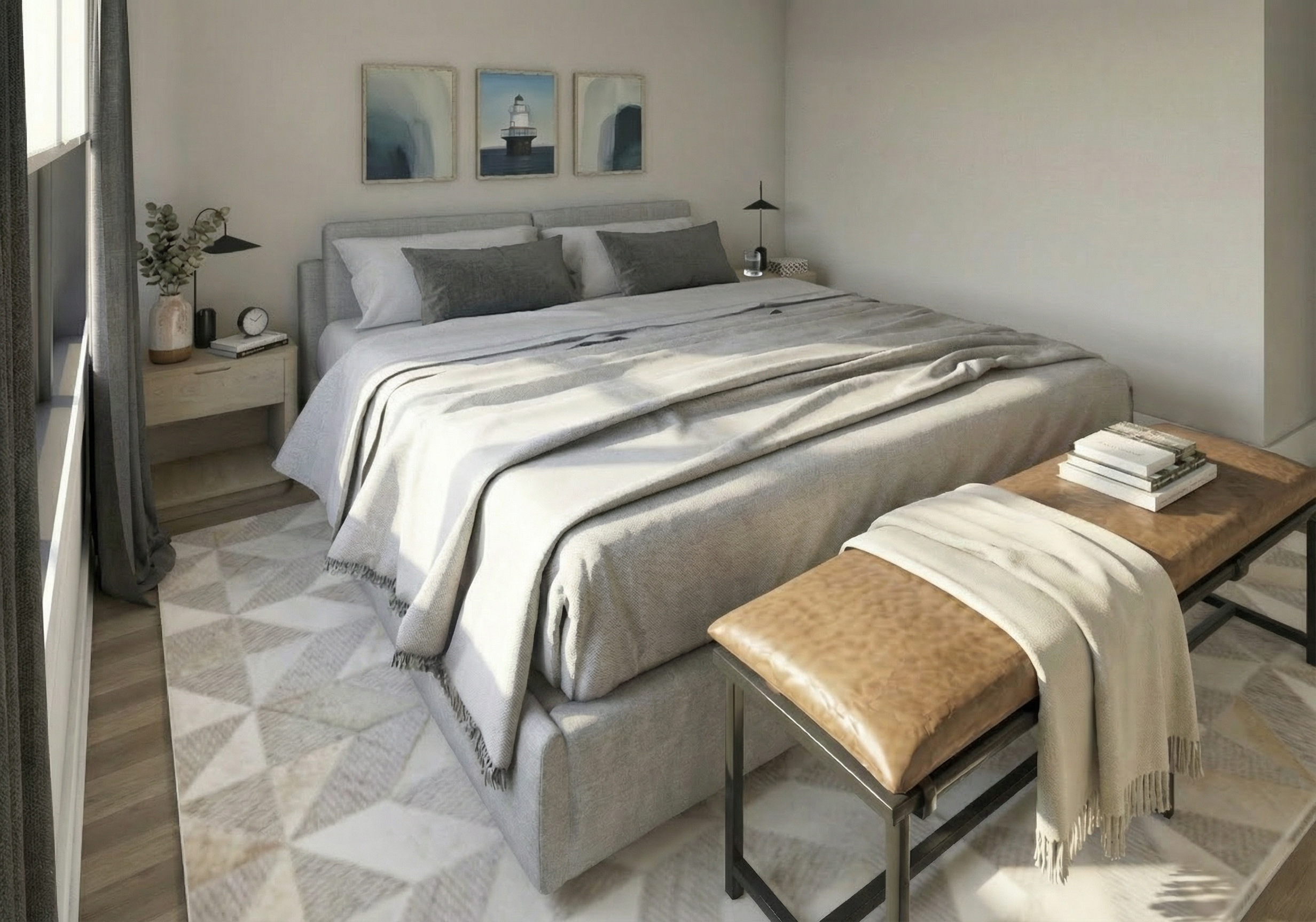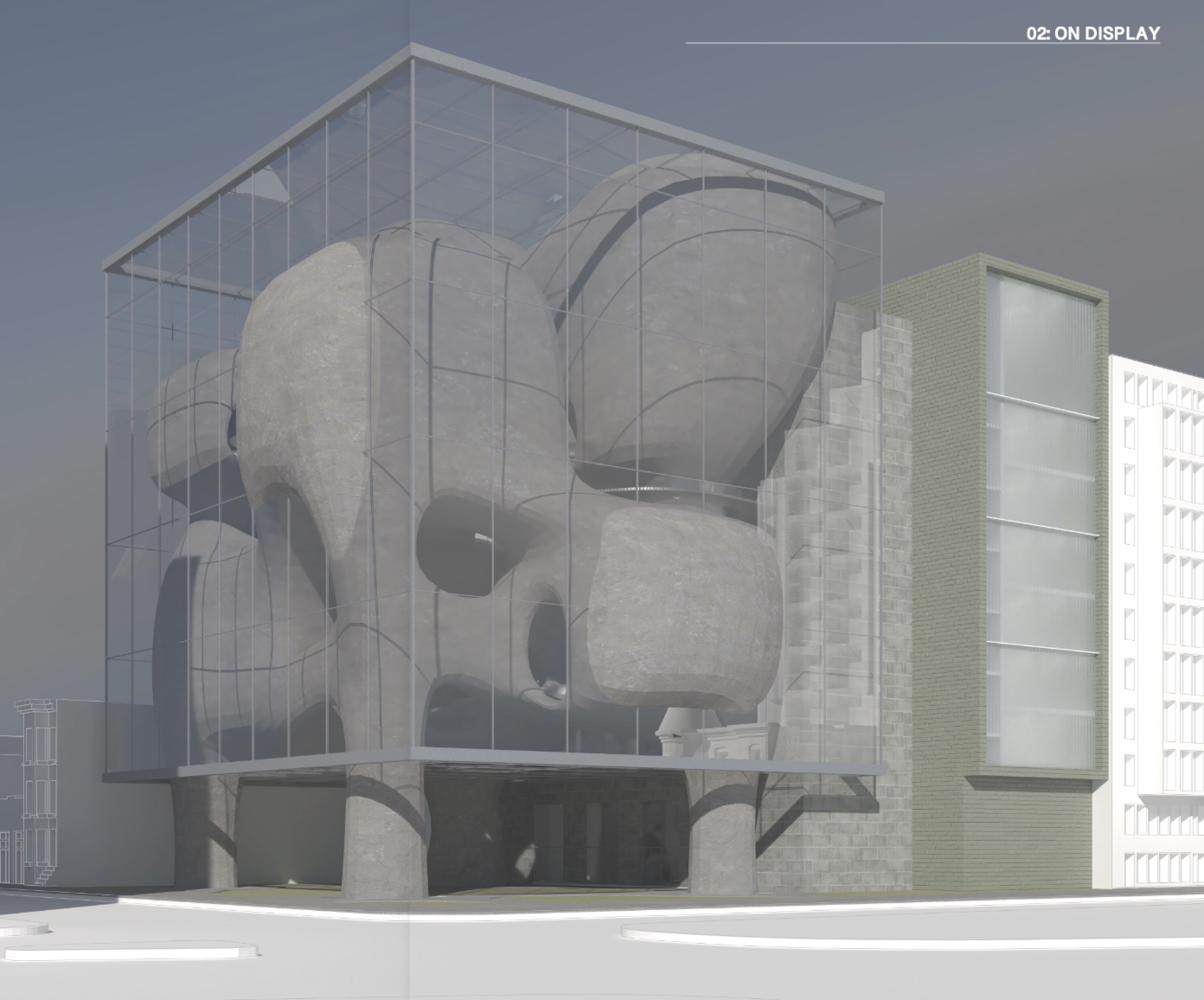 photo realistic rendering with glass box and sculptural element inside glass box at dusk