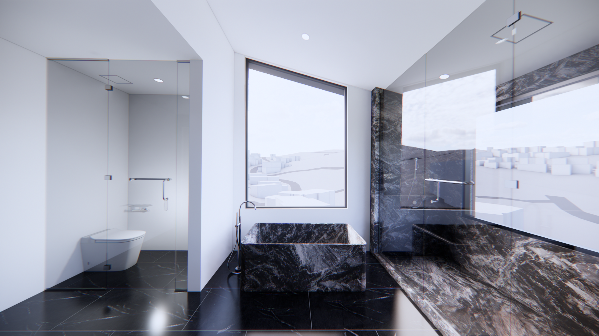 show a tall hedge and tree behind the window do not show any houses or structures in the reflection