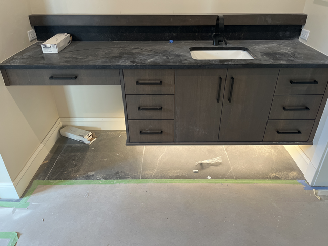 do not change the cabinets in any way preserve the exact cabinet colors materials finishes dimensions door and drawer styles hardware spacing alignment and all geometry exactly as shown do not alter the countertop shape backsplash appliances flooring lighting fixtures or wall structure only remove the construction materials clutter and mess from the scene clean the room and make it look finished and staged add a few simple tasteful home accessories appropriate for the style of the space but do not add or remove any furniture windows or architectural elements maintain the original lighting direction and realism enhance clarity and polish the photo while keeping the cabinetry and room design completely unchanged do not alter the lighting to keep the cabinet colors as they are in the image stage the countertop for a bathroom put a towel on the bar and add a mirror above the backsplash