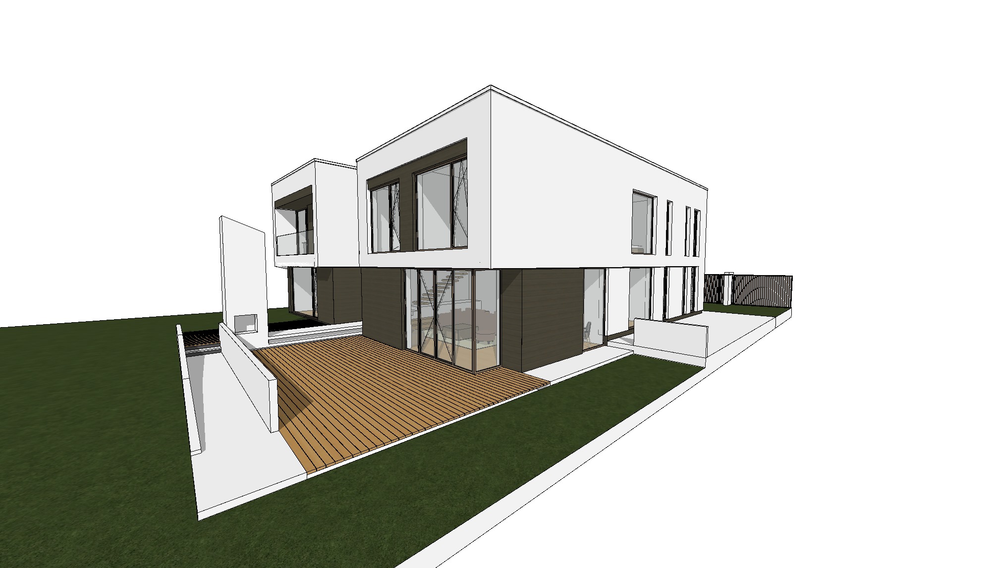render this modern residential building exactly as modeled strictly preserving the original architecture proportions geometry and all design details do not modify or reinterpret the structure in any way lighting use soft diffuse daylight overcast sky conditions avoid strong sunlight harsh shadows or high contrast ensure even calm illumination across all surfaces materials and textures all white surfaces must remain clean smooth matte white plaster all brown surfaces should be replaced with horizontal oak wood slats timber cladding in a warm natural oak tone with subtle realistic texture window frames and doors should be made of wood matching the oak tone of the cladding with a refined high quality finish environment add realistic green grass surrounding the building include decorative landscaping such as ornamental grasses and low shrubs keep vegetation natural and not overly dense add a modern paved driveway using light stone or concrete texture style photorealistic architectural visualization contemporary minimalist aesthetic balanced contrast between white volumes and warm wood elements high quality rendering with realistic materials and subtle detailing