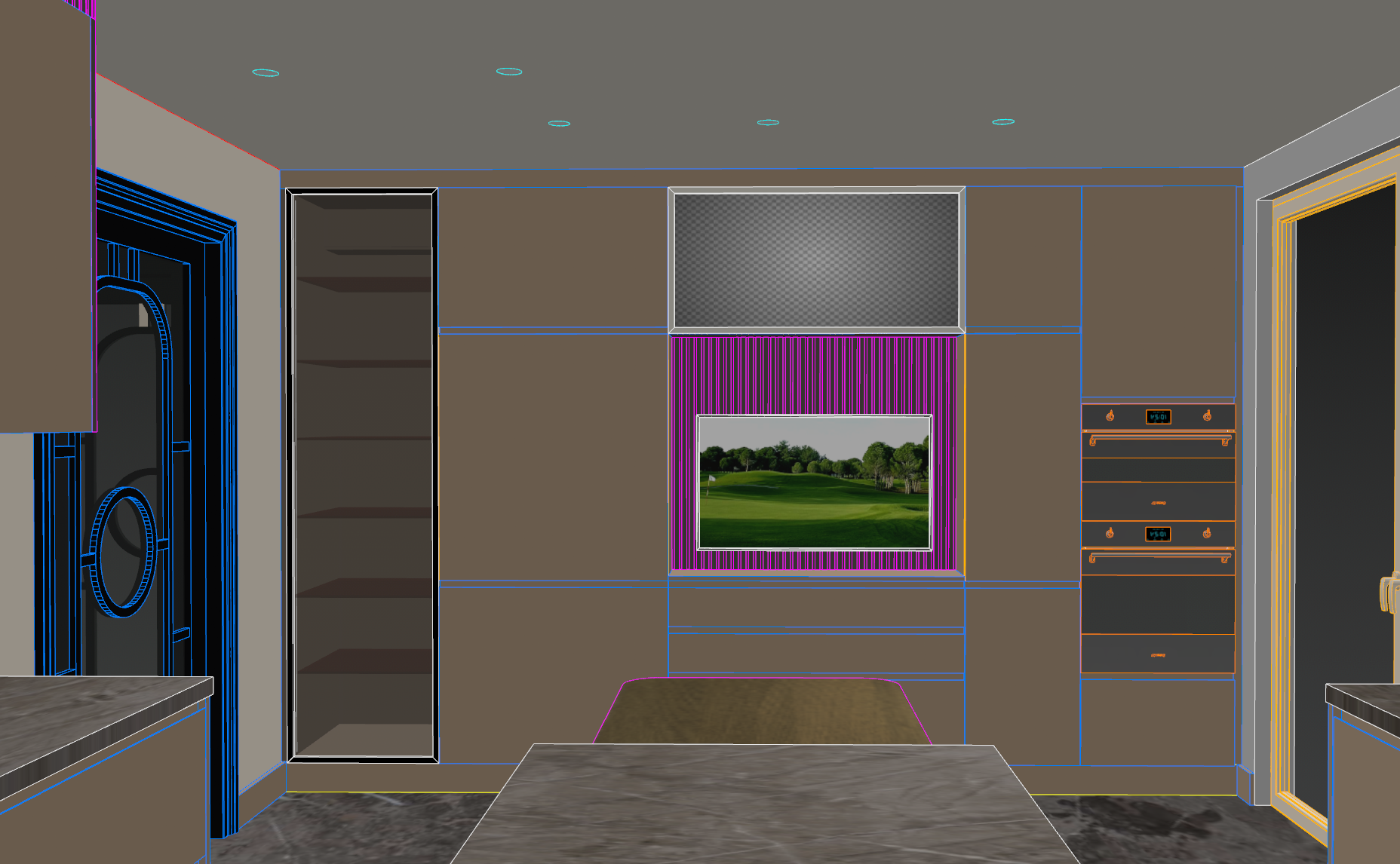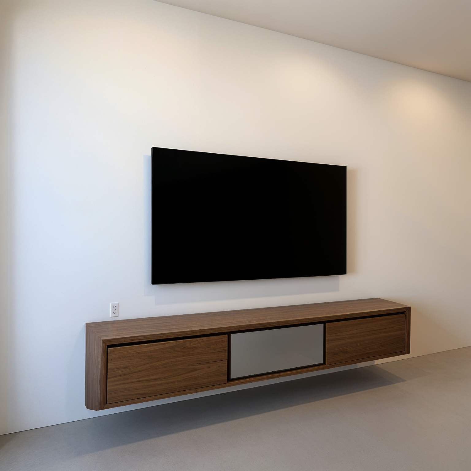 left glass door cabinet has led inside devices will have black glass cabinet colors will be light beige the table will look wooden
