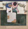 create a photorealistic straight on interior rendering of a modern loft living area based on the provided plan the camera should be positioned at eye level centered looking directly toward the main seating wall with a perfectly flat frontal view no perspective distortion design style warm minimal soft luxury calm neutral palette with layered textures layout center the composition on a modular sectional sofa placed against a built in shelving wall coffee table in front aligned with sofa rug underneath defining the seating zone keep layout clean and symmetrical materials colors match inspiration exactly walls soft warm beige taupe matte finish smooth texture built in shelving warm medium wood tone walnut like visible natural grain matte finish shelves integrated into wall minimal and clean sofa light cream ivory fabric soft and plush texture low profile modern slightly rounded edges pillows mix of neutrals with accents of soft sage green and muted teal patterns subtle texture not too busy rug light neutral tone cream sand soft woven texture slightly tonal variation coffee table modern sculptural form dark wood or smoked finish smooth matte surface side table minimal darker tone for contrast lighting soft natural daylight entering from the side not visible window warm indirect lighting integrated into shelving niches ceiling minimal linear recessed lights very subtle decor styling keep shelves minimally styled neutral books small sculptural objects in ceramic stone matte finishes only add one soft decorative object on coffee table book or tray rendering details ultra realistic textures fabric softness on sofa wood grain clearly visible subtle shadows and depth balanced warm lighting no harsh contrast clean calm high end look no people output style straight on elevation style render photorealistic soft warm neutral aesthetic