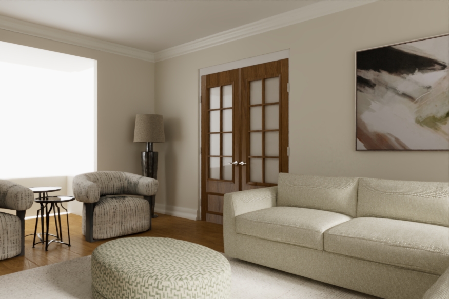 improve the lighting quality turn the floor lamp on add bay window u shaped white frame with critalls add two cushions on the sofa one is in the pastel green and one natural