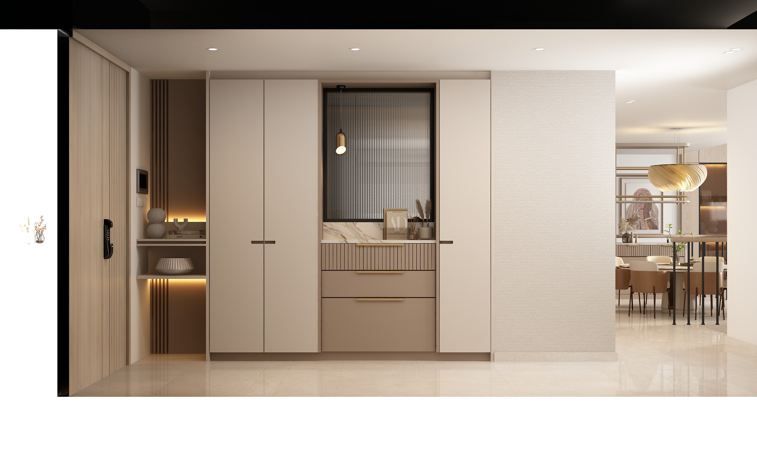 change the black railing near dining chairs with glass railing keep other thing as it is