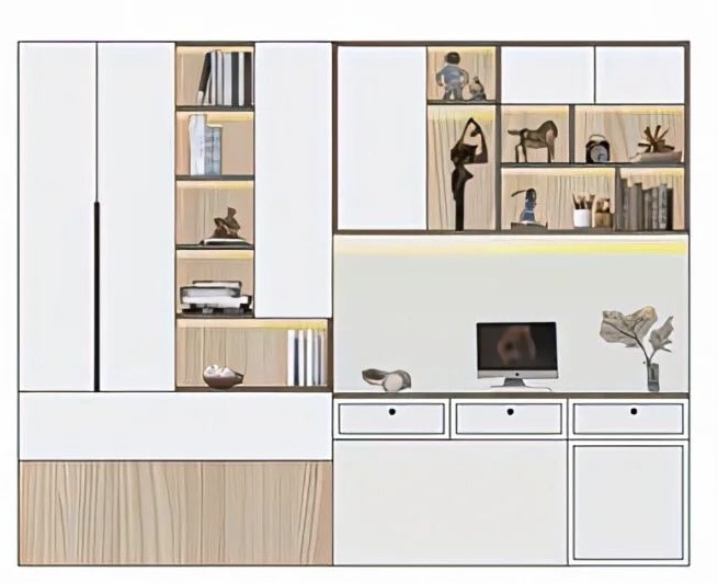 photo realistic built in storage cabinet matte white cabinet doors light oak wood grain shelves and accents soft warm led strip lighting decorated with books sculptures and ornaments modern home office mood scandinavian minimal style bright natural daylight shot front view like interior magazine photo keep layout exactly as input image no changes to the position of elements